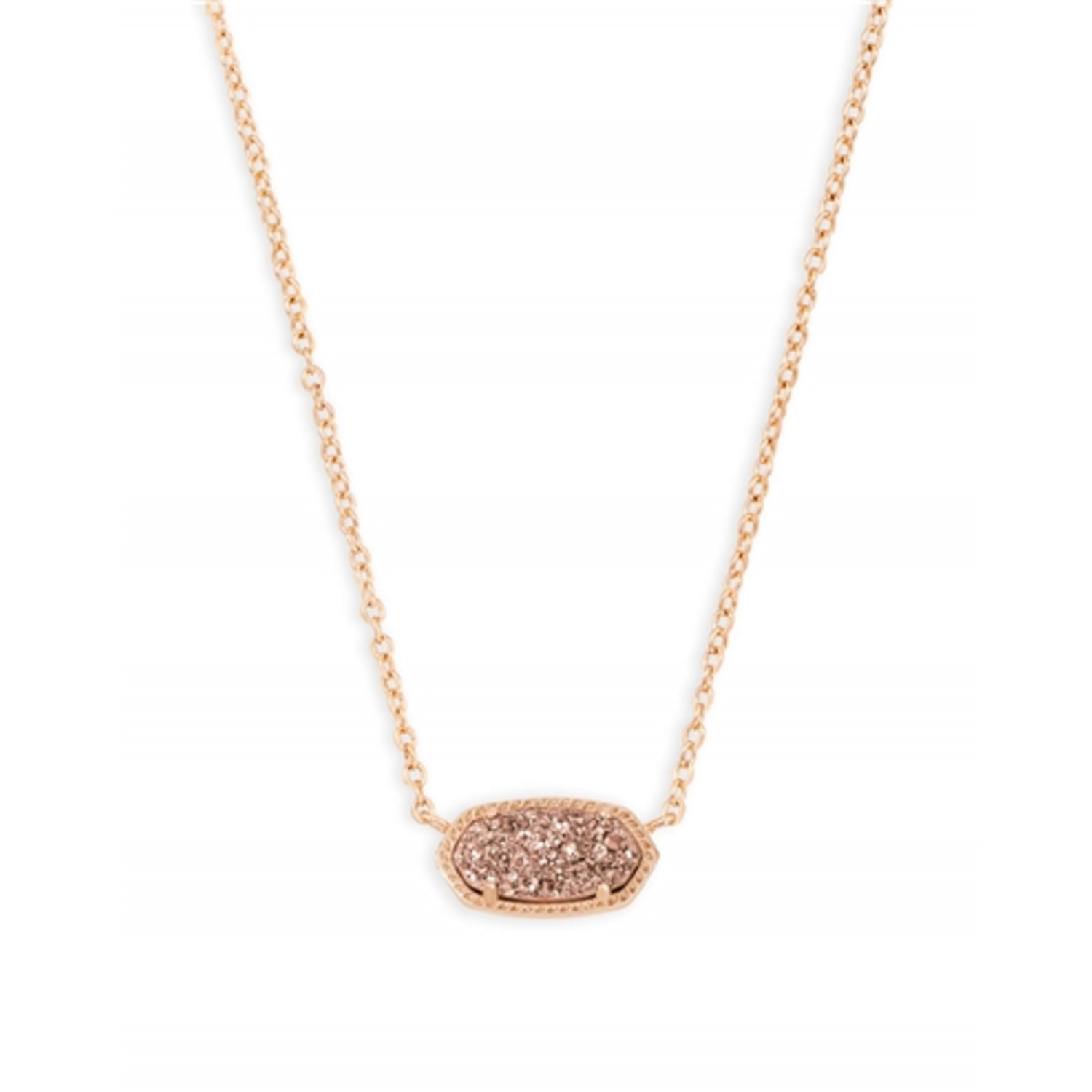 This fascinating looking with a dainty stone and delicate metallic chain combine to create the Elisa Pendant Necklace in Rose Gold Drusy, your new favorite wear-anywhere accessory. This pendant necklace can be paired with any look, providing that extra touch of timeless style. 14k Rose Gold Plated Over Brass, Size: 0.63"L x 0.38"W stationary pendant, 15" chain with 2" extender Lobster claw closure, Material: Rose gold drusy.