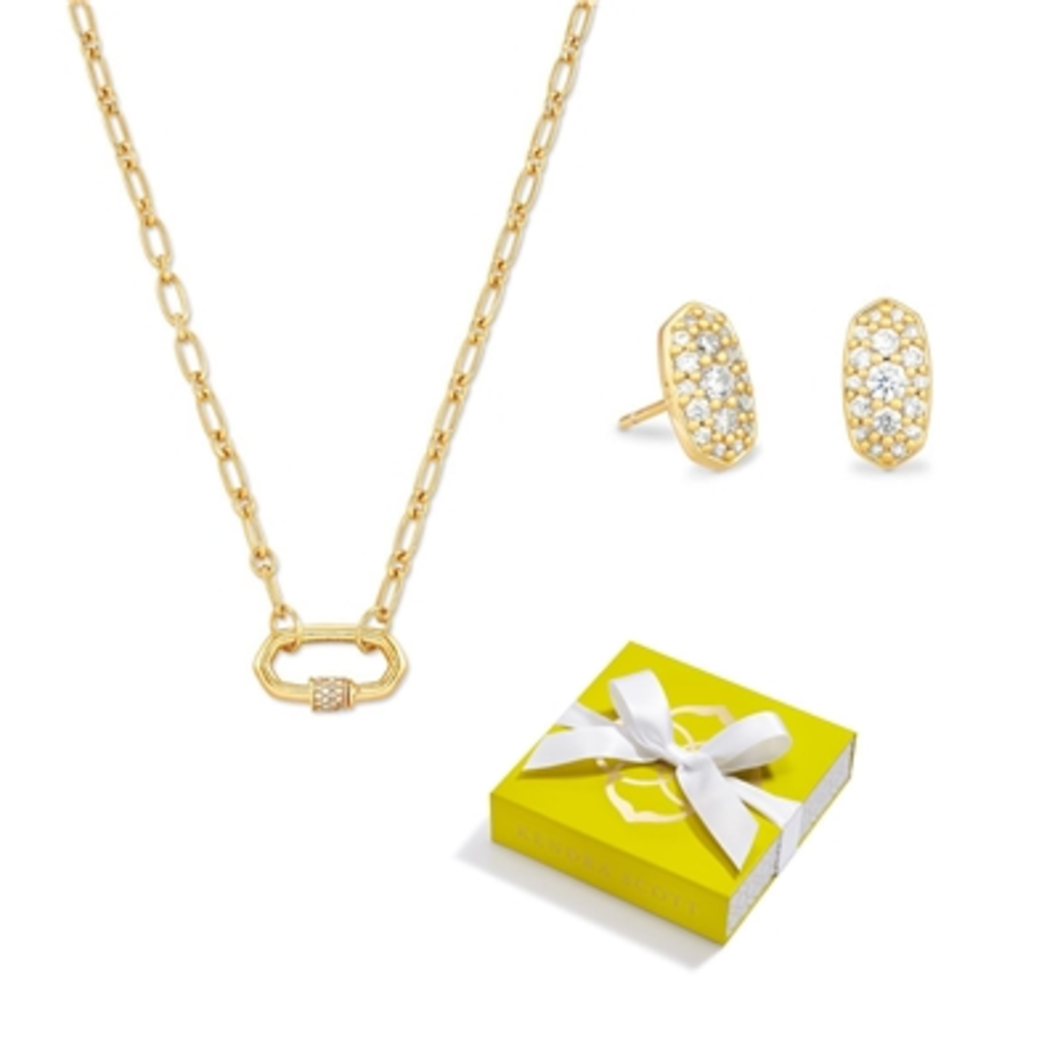 Elevate your style effortlessly with the Grayson Crystal Stud Earrings, sophisticated and set to sparkle from every angle in White Crystal, measuring .41"L x 0.22"W. Pair them with the Bristol Link Necklace, the latest in layering featuring an 18k Yellow Gold Vermeil linked chain in White Sapphire, designed to last, with an 18" chain and a center measuring 0.72"L x 0.37"W. These timeless pieces will complement any outfit, whether you're dressing up or down. This set arrives in a Kendra Scott Signature Yellow Gift Box with a white bow, making it perfect for gifting.