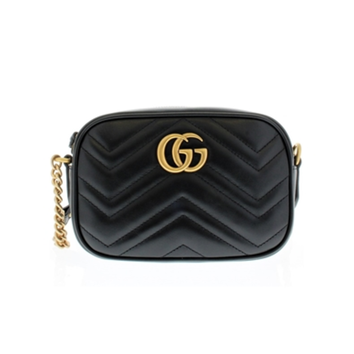 The mini GG Marmont chain shoulder bag has all the glamour and luxury of its larger Marmont sisters while being more portable- great things come in small packages. Luxury does not need to be sacrificed for utility with Gucci's innovative design. The smooth, soft leather is stitched in a Matelassé chevron pattern and features a GG pattern stitched into the back. Black leather exudes sophistication, while gold hardware GG logo and chain strap accents with leather shoulder detail brings glamour to any outfit. This bag is The Little Black Bag everyone needs. Bring fashion wherever you go. Features: Interior open pocket, Chain shoulder strap with 23.5" drop, Zip top closure, Microfiber lining with a suede-like finish.