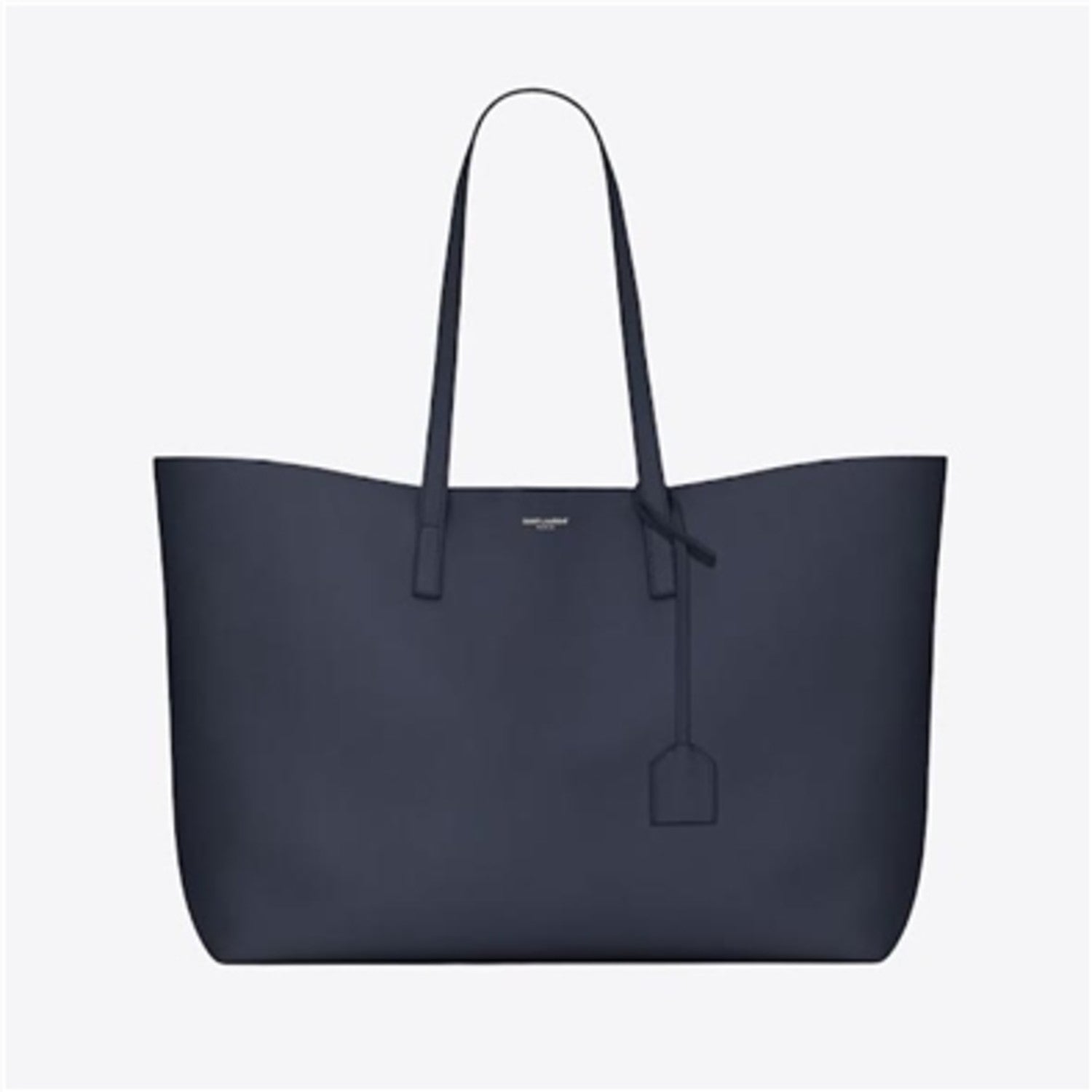 This made in Italy Saint Laurent calfskin tote bag includes a magnetic snap closure with gold toned hardware and a handle drop of 9.3 inches. Attached to the bag is the removable metal charm and removeable zip pouch. This casual style bag built for both genders comes in navy color.