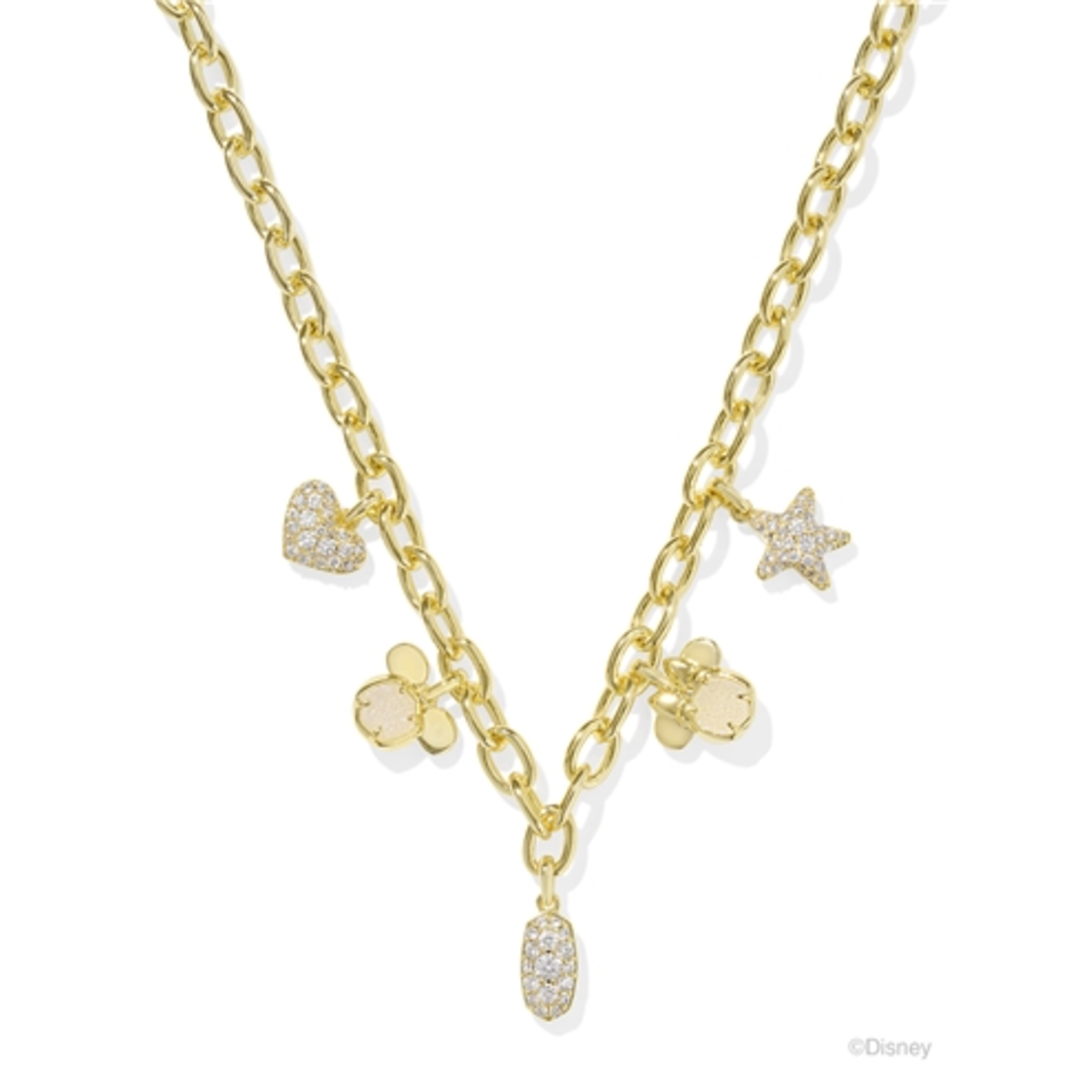 Make your look totally charming with the Disney | Kendra Scott Gold Mickey Mouse and Minnie Mouse Charm Necklace in Iridescent White Mix. This necklace features a mix of charms, including Disney's eternal sweethearts and some of our most iconic Kendra Scott shapes. With its bold chain and top-notch sparkle, this one is a total must-have. Metal: 14k Yellow Gold Over Brass. Size: 17"L, 0.48"W. Includes 3"L Extender.