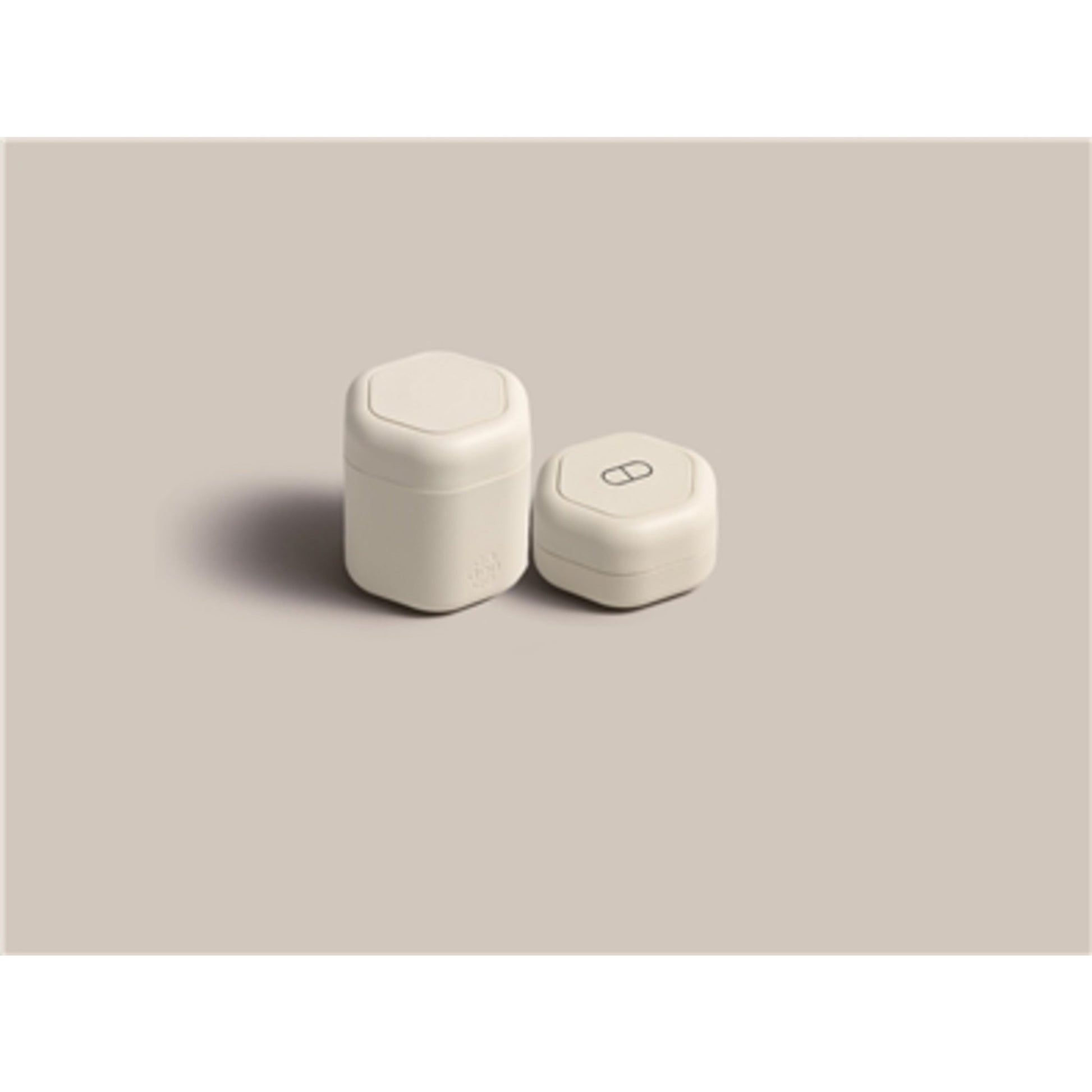This set features one Medium Capsule (1.32 fl oz) with a blank label and one Small Capsule (0.56 fl oz) with a pill icon. Color: Sand. TSA-approved.