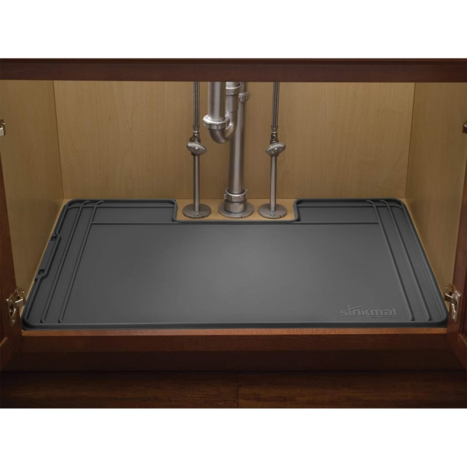 Introducing SinkMat – the ultimate solution to safeguard your kitchen and bathroom sink cabinets from potential damage. With a ½" high surrounding edge, SinkMat expertly contains liquids, providing a protective barrier in case of leaks or spills. The waterproof, non-stick finish ensures effortless clean-up, while simultaneously deterring the formation of mold and mildew on the base and sides of your vanities. Perfect for homes, businesses, and rental properties, SinkMat offers peace of mind and practicality in one. Highlights include its ability to trim easily to fit your specific sink cabinet spaces allowing you to customize protection tailored to your needs. Upgrade your sink cabinet defense with SinkMat – where functionality meets convenience. Measures 46 1/4 X 19 7/8.