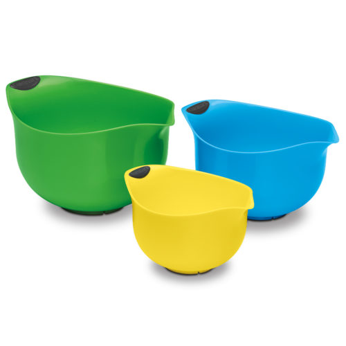 The Cuisinart Set of 3 Mixing Bowls includes a 1.5-Qt, 3-Qt, and a 5-Qt bowl. Each bowl features soft-grip handles and nonslip bottom. BPA Free & Dishwasher Safe. Color: Multicolor