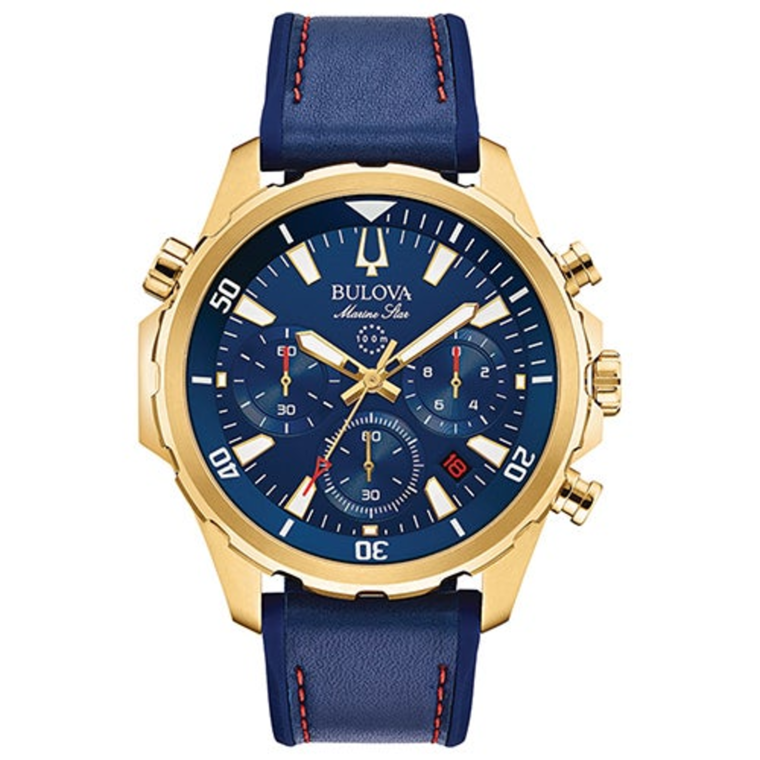 Marine Star watches are loaded with details. Blue leather and silicone strap with red stich detail. Blue dial with hour markers and three hands. Chronograph subdial measures minutes and seconds. Day of the month window between 4 and 5 positions. Stainless steel gold-tone rotating bezel. Signature gold-tone Bulova logo at 12 position. Screw-back case. Three-piece buckle closure. Flat mineral glass. Case thickness: 11.8mm. Case size: 43mm. Water resistant to 100 M.