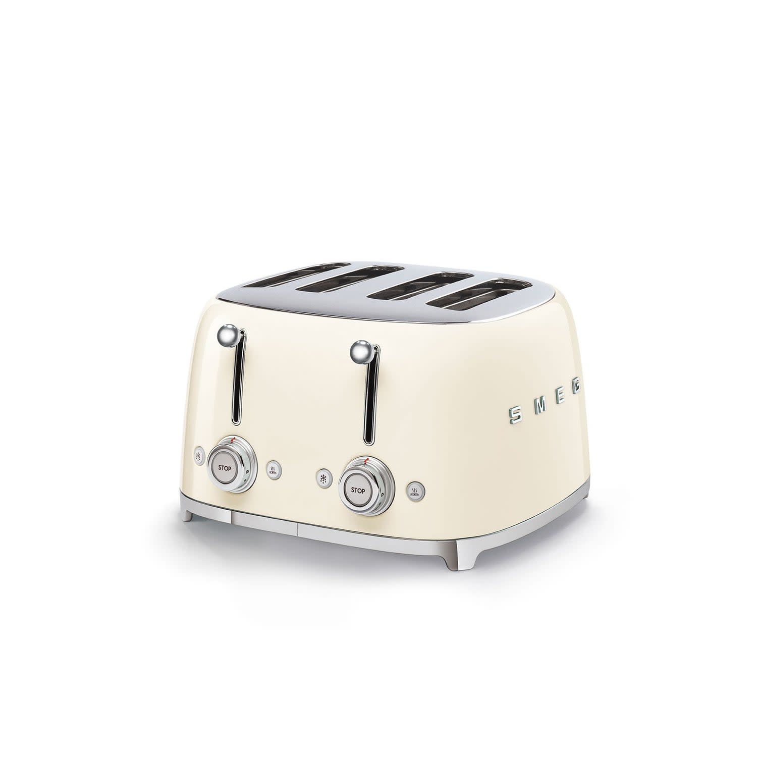 Smeg kitchen appliances offer retro Italian style carried from its founding in 1948. Multi-function control offers versatile toasting options. Features four spacious slots with two independent control panels. Reheat heats toast and bread or continue toasting. Defrost unfreezes frozen slices. Bagel function browns one side of bread without toasting the other. Self-centering racks supports even toasting no matter the size. Offers 6 toasting levels. Backlit buttons and control knobs. 2 Removable crumb trays. Anti-slip feet. Integrated cord.