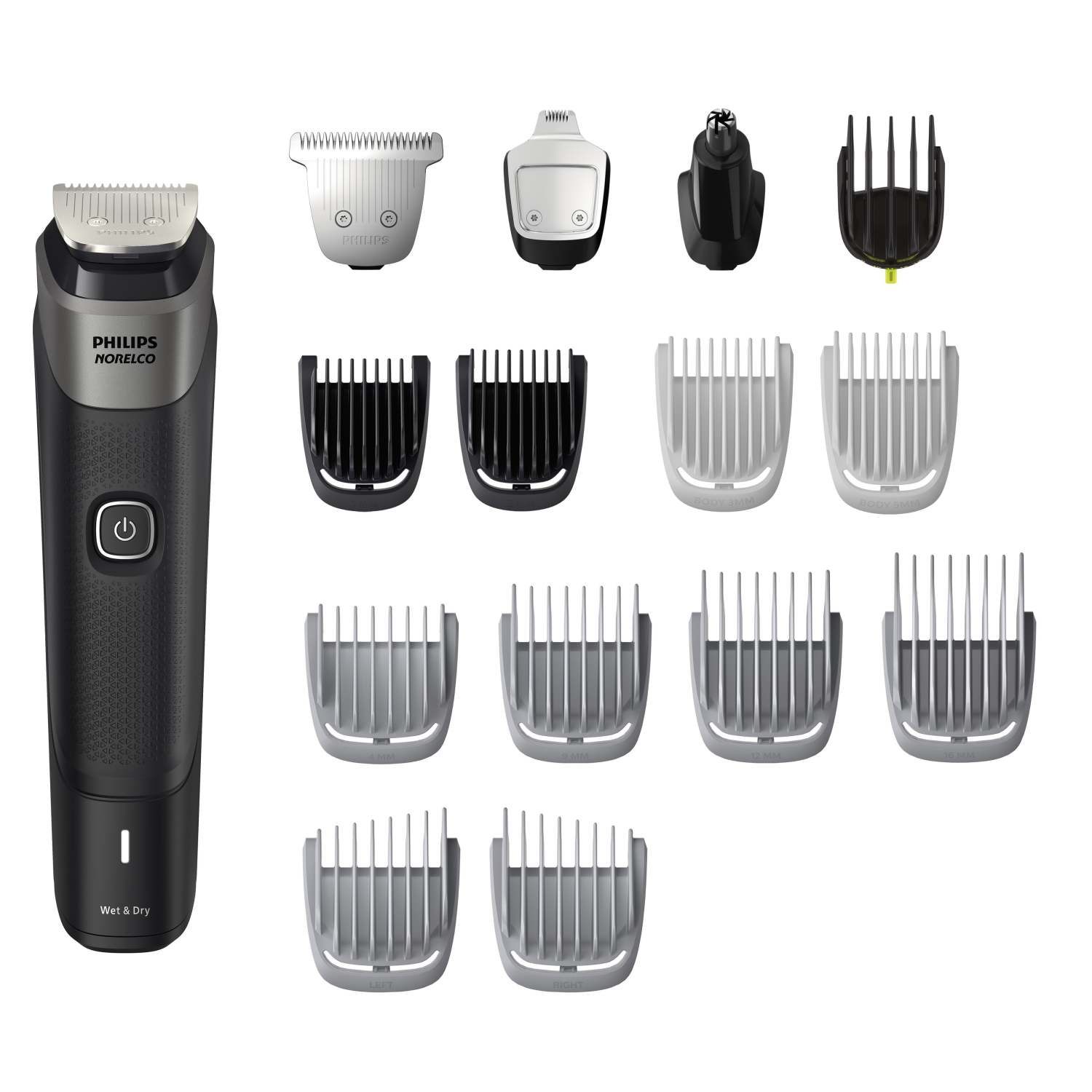 The all-in-one trimmer offers 18 tools and access for face head and body. Multi-guard set offers 9 length settings from 0.5 to 16mm. Trim ear and nose hair easily and comfortably. Stainless steel blades remain sharp for long lasting performance. Lithium-ion battery lasts up to 2.8 hours on a single charge. Fully washable. Includes: Steel trimmer. Steel precision trimmer. Nose and ear trimmer. Extra-wide hair trimmer. 3-7mm Adjustable guard. 4 Wide hair guards. 2 Wide fading hair guards. 2 Body guards. 2 Stubble guards. Soft pouch. Cleaning brush.