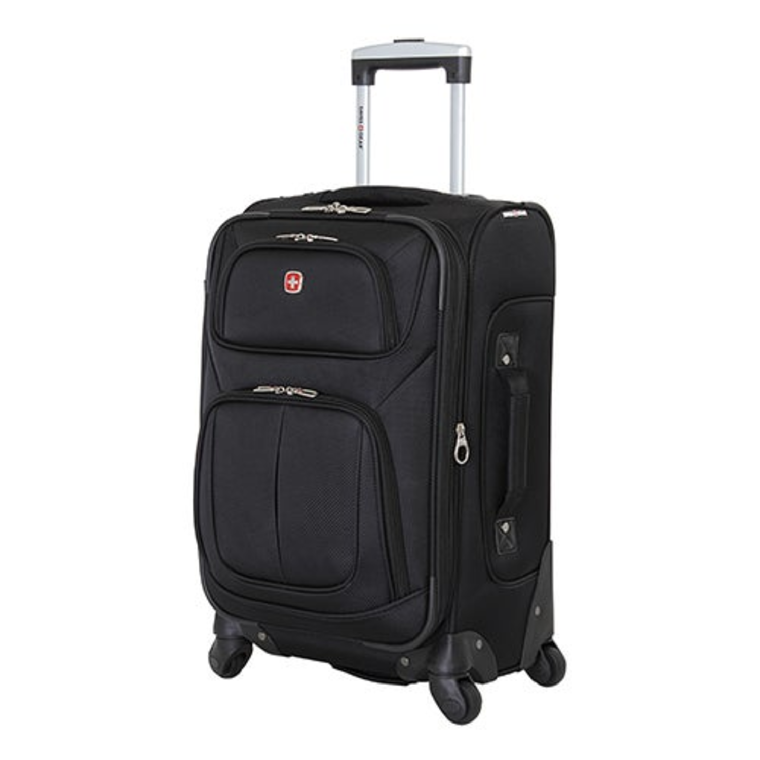 Push button locking telescopic handle supports easy pushing or pulling. Four 360-degree multi-directional spinner wheels gives maximum maneuvering. Reinforced padded top side and bottom handles for easy lifting and carrying. Expands for additional interior space. Two front panel pockets. Zippered lid pocket and side mesh pocket. Interior has removable zippered wet pouch. Adjustable tie-down straps. Integrated ID tag. Durable scuff resistant polyester material. Dimensions: 22.75" x 14.25" x 10.25".