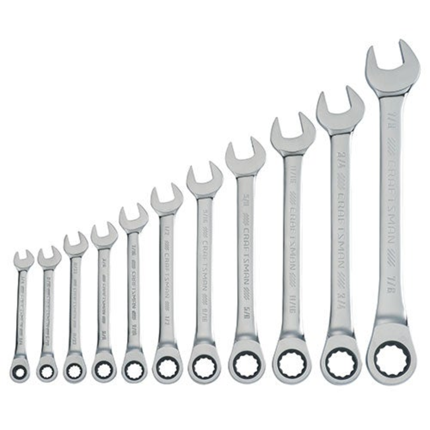 This wrench set is ideal for bolt turning to specific automotive repairs. Full polish chrome finish is corrosion resistant. 12 Point box makes it easy to engage and fasten. 15-Degree box end offset supports additional knuckle clearance. 72 Tooth ratcheting box end helps get to hard-to-reach places. Large markings provide easy size identification. Includes 11 SAE ratcheting wrenches - 1/4" 5/16" 3/8" 7/16" 1/2" 9/16" 5/8" 11/16"< 3/4" 7/8" 15/16".