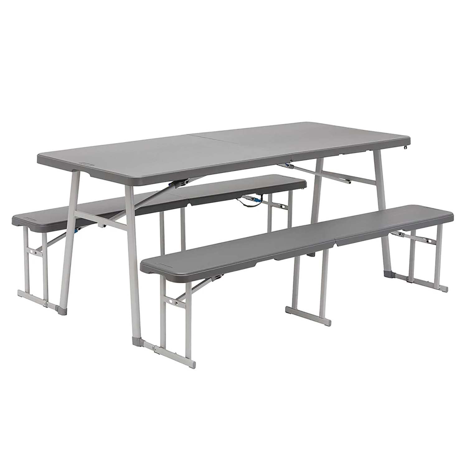 Eat together on your next family camping trip. 3-in-1 Versatility - picnic table individual table sitting bench. Lightweight stain and UV-fade resistant top surface. Rust resistant powder-coated steel frame withstands the elements. Oversized pinch-free buttons automatically lock securely. Tool-free connection easily and securely attaches legs to table. Benches feature telescoping connector with two distance settings. 300lb Table weight limit. 600lb Bench weight limit. Table dimensions: 72"L x 36"W x 29"H. Folded table dimensions: 36"L x 30"W x 3.5"H.