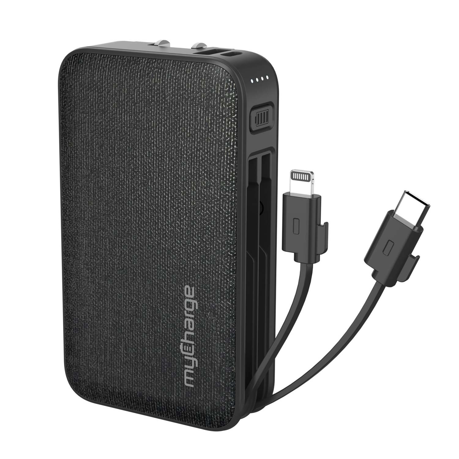 Stay charge on the go even if you forget the cords. Built-in 6000mAh battery recharges devices when you need it. Charge up to 4 devices at once with built-in cables and 2 ports. USB-C and Lightning cables built-in for various device use. One USB-A and one USB-C port. 4 LED battery indicator lights. Provides up to 32 hours of battery life. Wall prongs built-in - 100-240V AC 3.4A max output. Features stylish fabric and rubber coated finishes. Dimensions: 4.26" x 1" x 2.5".