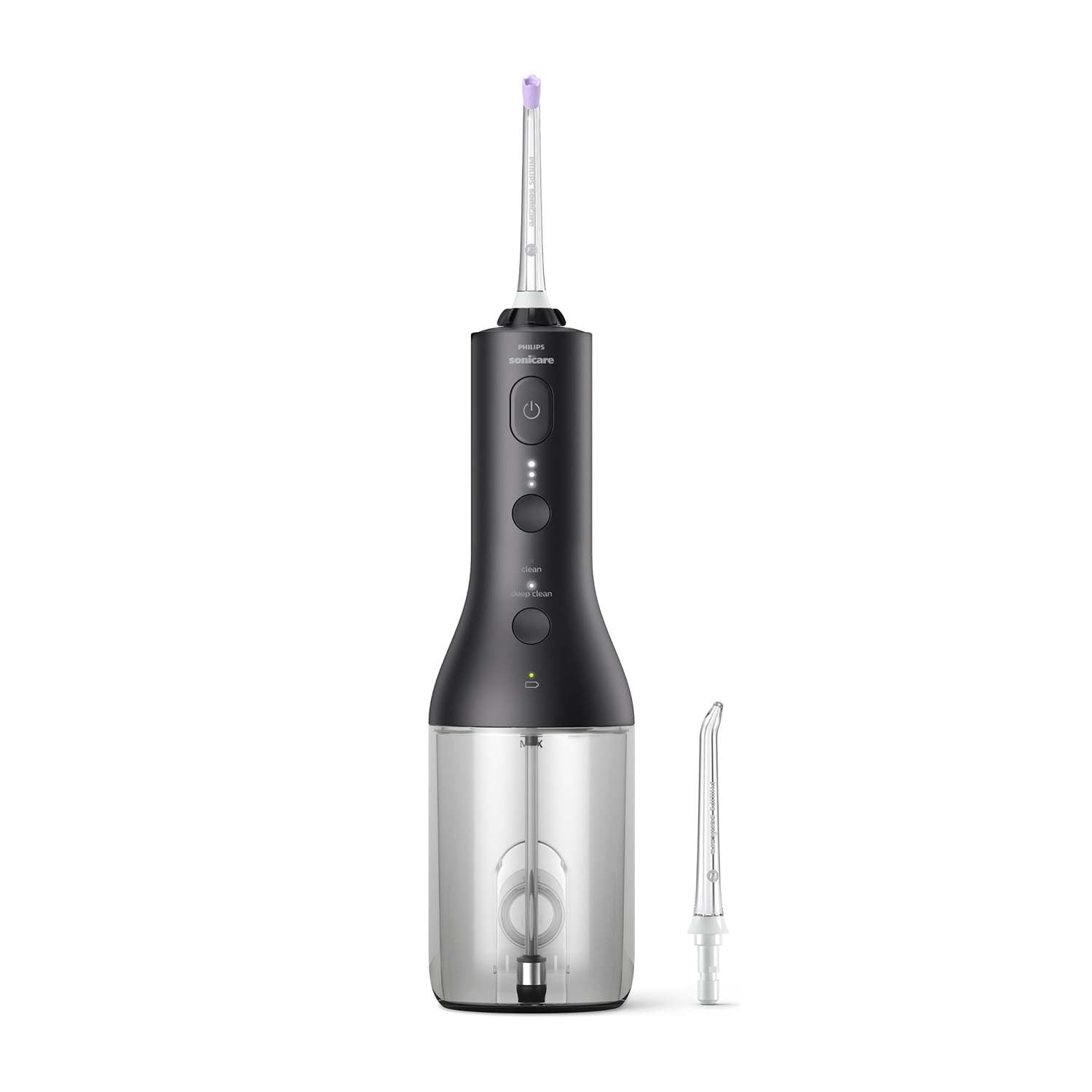 Effortlessly clean between teeth with the power flosser. Helps remove up to 99% of plaque in treated areas. Quad Stream technology - faster deeper clean. Pulse Wave technology - gentle pulses guides from tooth to tooth. 2 Flossing modes and 3 intensities. Nozzle reaches hard-to-reach areas and rotates 360-degrees. Use Standard tip for spot cleaning. Charge with USB-A to small plug cable. 250ml Reservoir is easy to fill. Slim ergonomic handle with easy on/off. Includes: F1 Standard nozzle. F3 Quad Stream nozzle. USB charging cable. USB wall adapter.