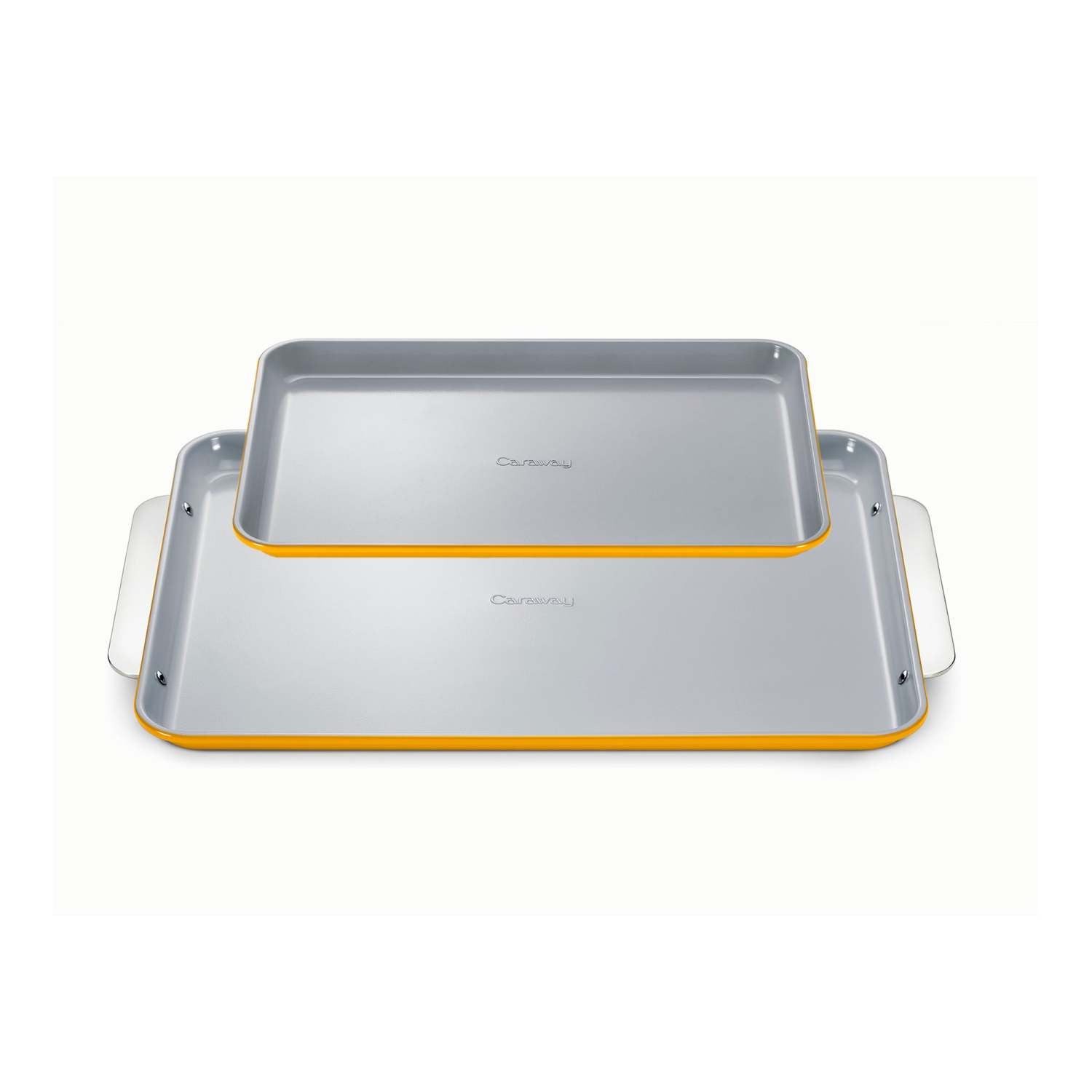 Ready Set Bake - Caraway has made it easier and safer for you. The Baking Sheet Duo is great for baking cookies to roasting vegetables. Super slick nonstick requires less oil or butter for cooking. Nonstick supports minimal scrubbing for a spotless clean. Coating is free of PTFE PFOA PFAS heavy metals and hard anodization. Surface heats consistently without any hot spots. Handles on large sheet for easy carrying. Aluminized steel body. Oven safe up to 550F. Recommend hand wash. Includes: 15" x 10" Medium baking sheet. 18" x 13" Large baking sheet.