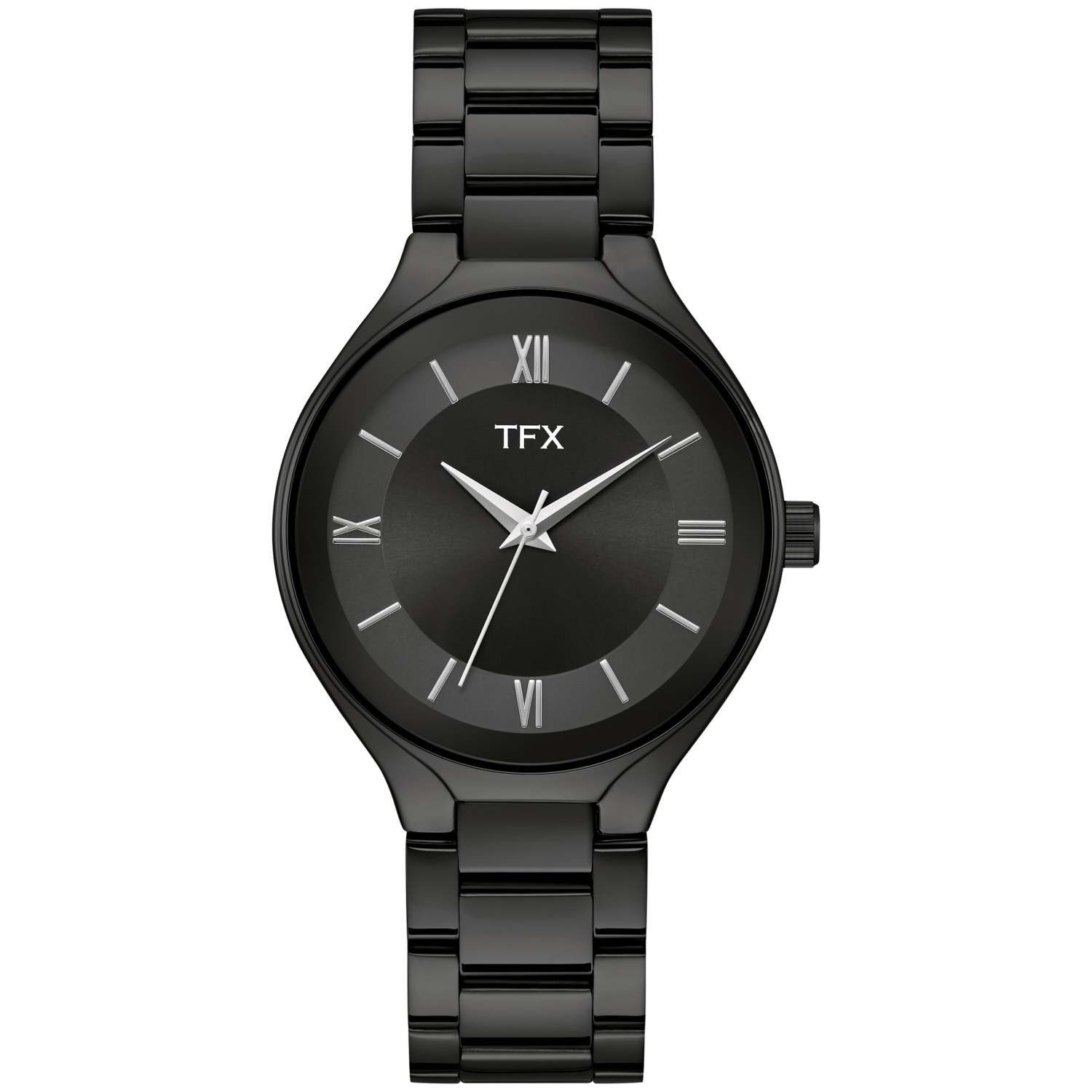 Black ion-plated stainless steel bracelet bezel and case. Black dial with three silver-tone hands. Silver-tone Roman numerals and hour indices. Signature silver-tone TFX logo below the 12 position. Quartz movement. Deployant closure. Case size: 38mm. Water resistant to 30 M.