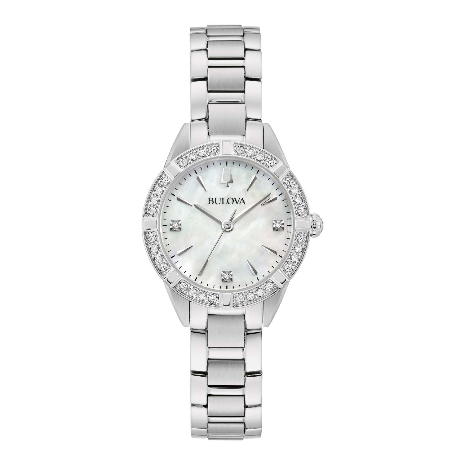 This Sutton watch offers a sophisticated style to any look. Silver-tone stainless steel slim H-link bracelet bezel and case. Mother-of-Pearl dial with 3 diamond hour markers and stick indices. Signature Bulova tuning fork logo at the 12 position and three hands. Bezel is fully lined with 16 dazzling diamonds. Minute markers along the outer dial rim. Sapphire crystal dial window is scratch resistant. Double push button deployant button. Lug width: 12mm. Case size: 28mm. Water resistant to 30 M.