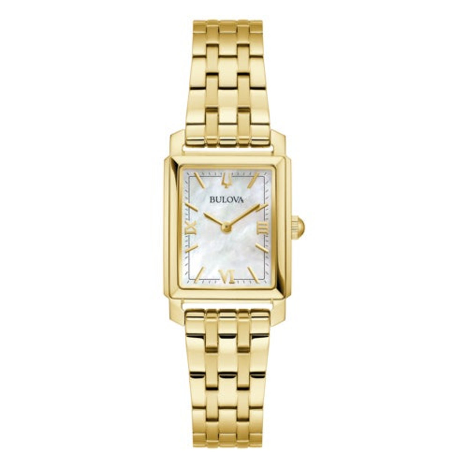 This Sutton watch will be the timepiece you never want to take off. Gold-tone stainless steel bracelet bezel and case. Mother-of-Pearl rectangle dial with gold-tone hour markers Roman numerals and three hands. Signature gold-tone Bulova tuning fork logo at the 12 position. Minute markers along the outer dial rim. Double push button deployant closure. Curved mineral crystal window. Quartz window. Lug width: 14mm. Case size: 21mm x 33mm. Water resistant to 30 M. 3-Year manufacturer limited warranty.