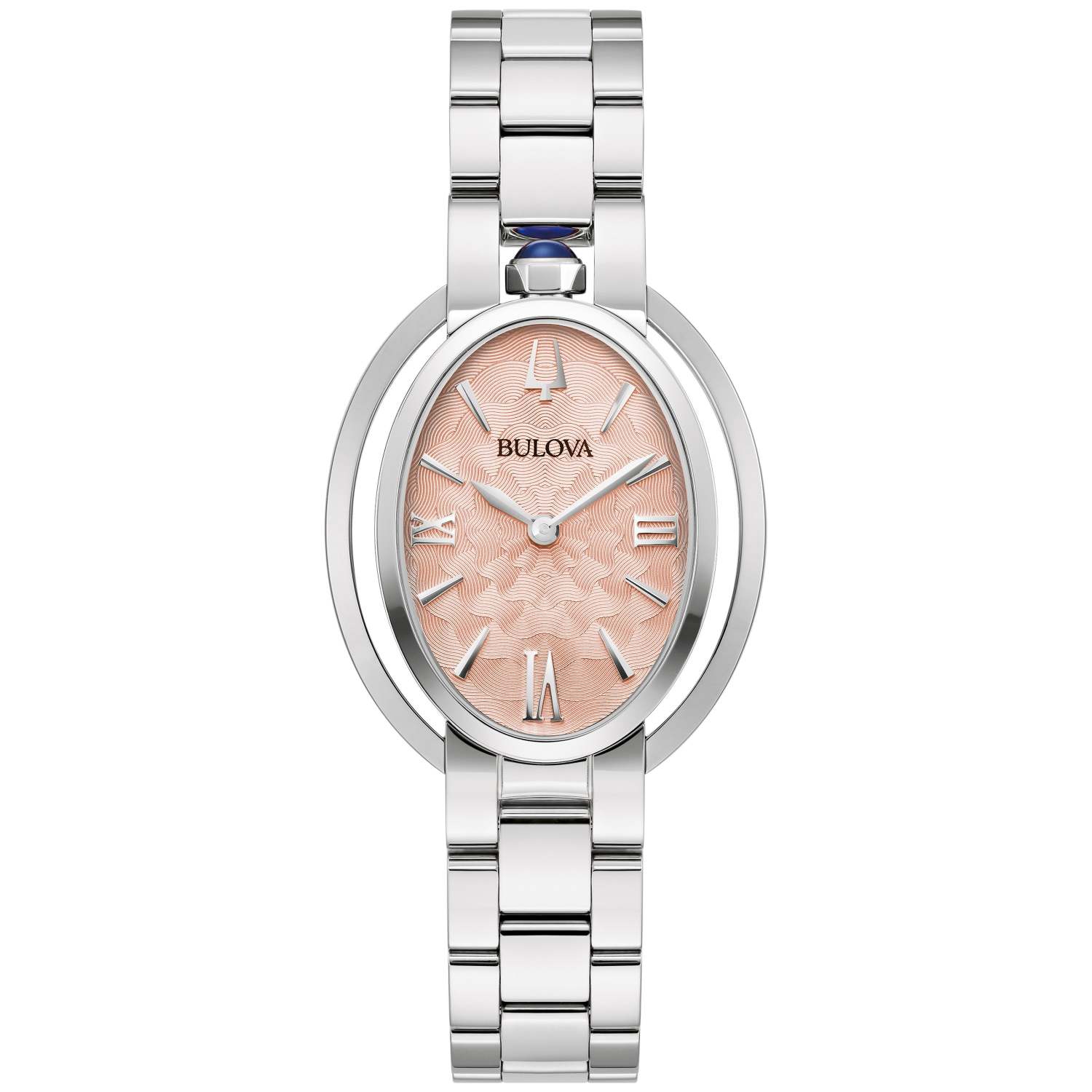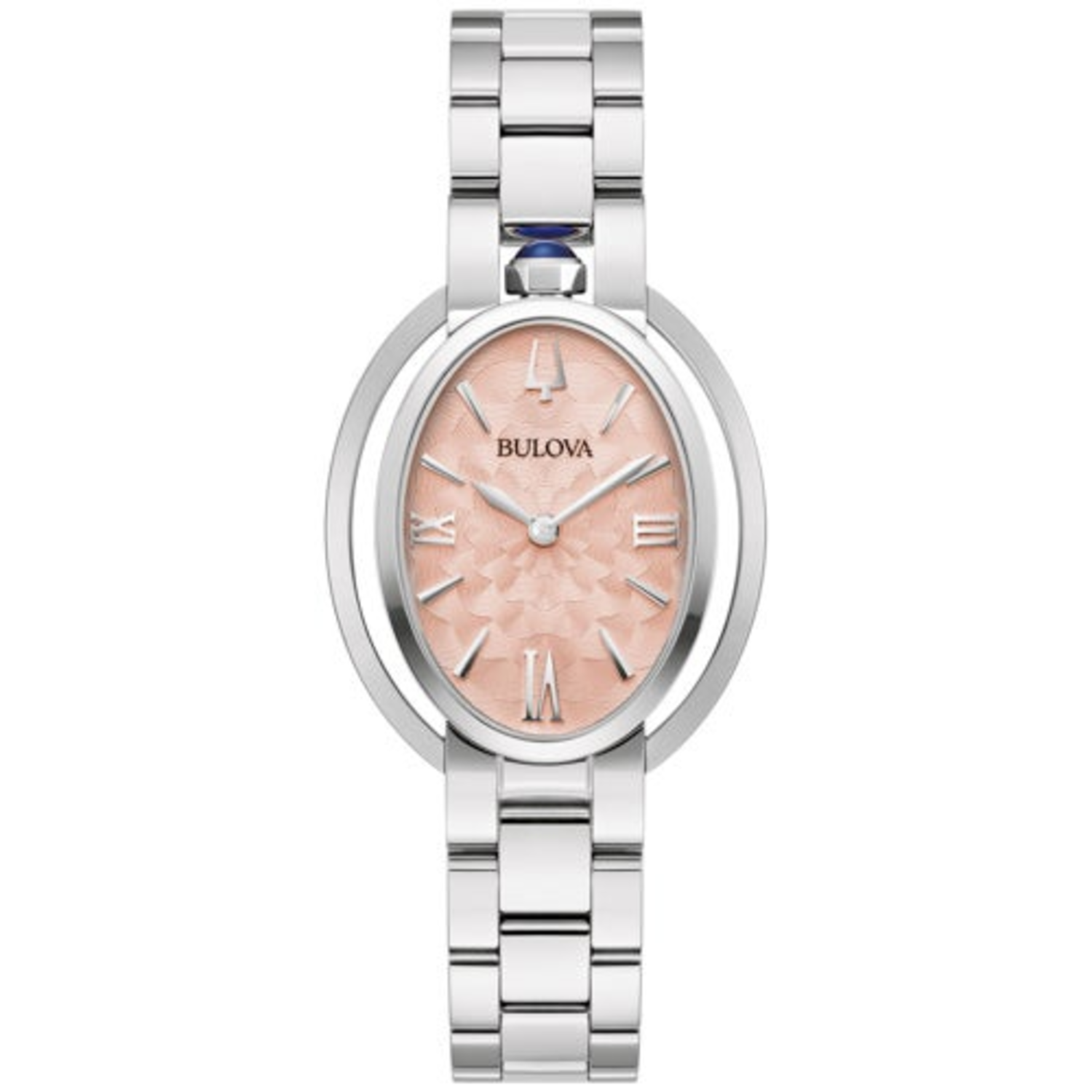 Rubayat makes a bold statement with its oval case and unique dial. Silver-tone stainless steel bracelet bezel and case. Salmon-tone oval dial with a guilloche-like texture. Dial also has silver-tone hour markers Roman numerals and hands. Blue synthetic spinel cabochon at the 12 position. Anti-reflective double domed sapphire crystal window. Double push button deployant closure. Quartz movement. Lug width: 8mm. Case size: 43.2mm x 28.8mm. Water resistant to 30 M. 3-Year manufacturer limited warranty.