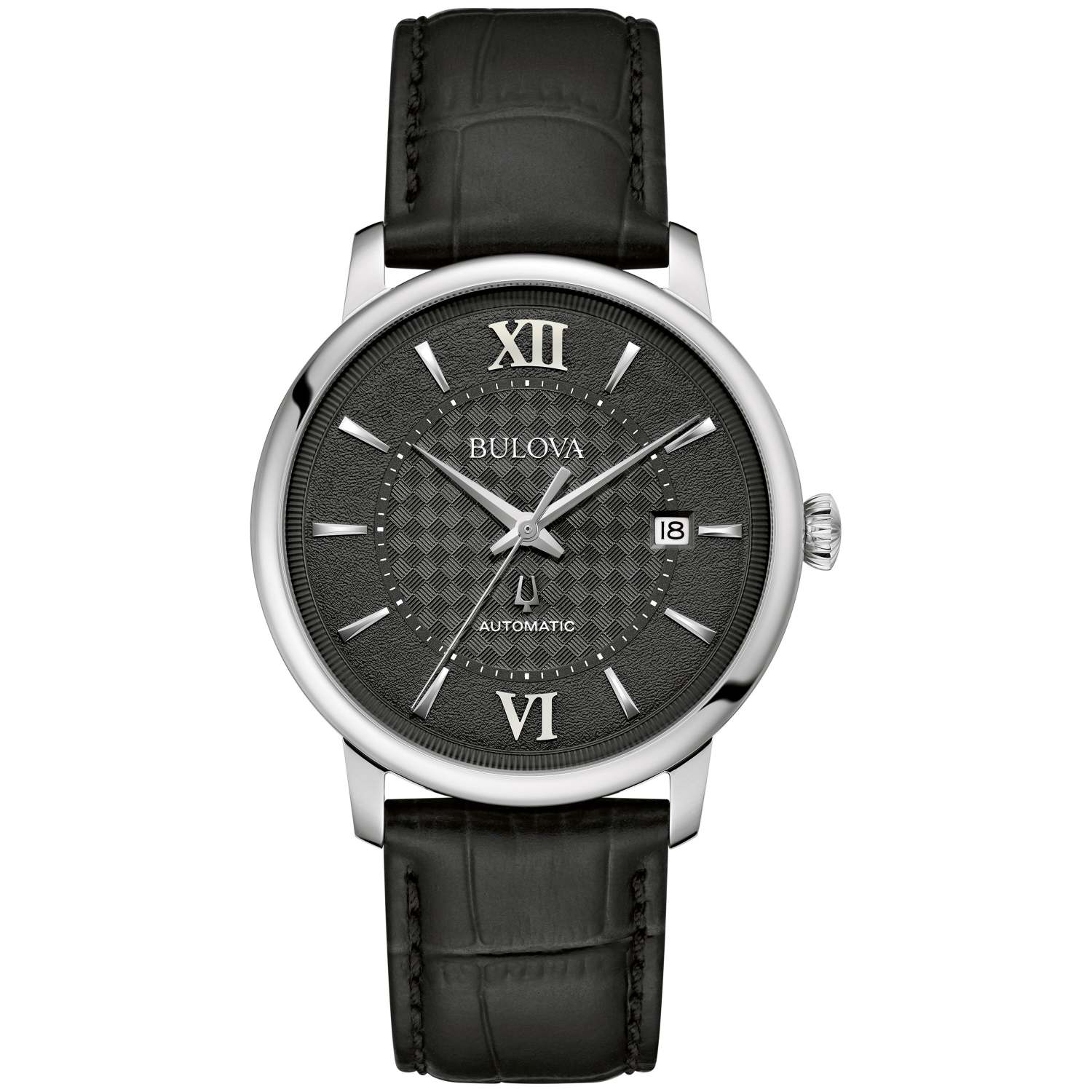 Hudson is a favorite dress watch from Bulova. Automatic movement with 21 jewels and a 42 hour power reserve. Black croc embossed leather strap with traditional buckle closure. Black dial with basketweave pattern and textural finishes. Day of the month calendar at the 3 position. Features silver-tone hour markers Roman numerals and three hands. Silver-tone stainless steel bezel and case. Onion shaped crown. Anti-reflective double domed sapphire crystal window. Lug width: 20mm. Case size: 39mm. Water resistant to 30 M. 3-Year limited warranty.