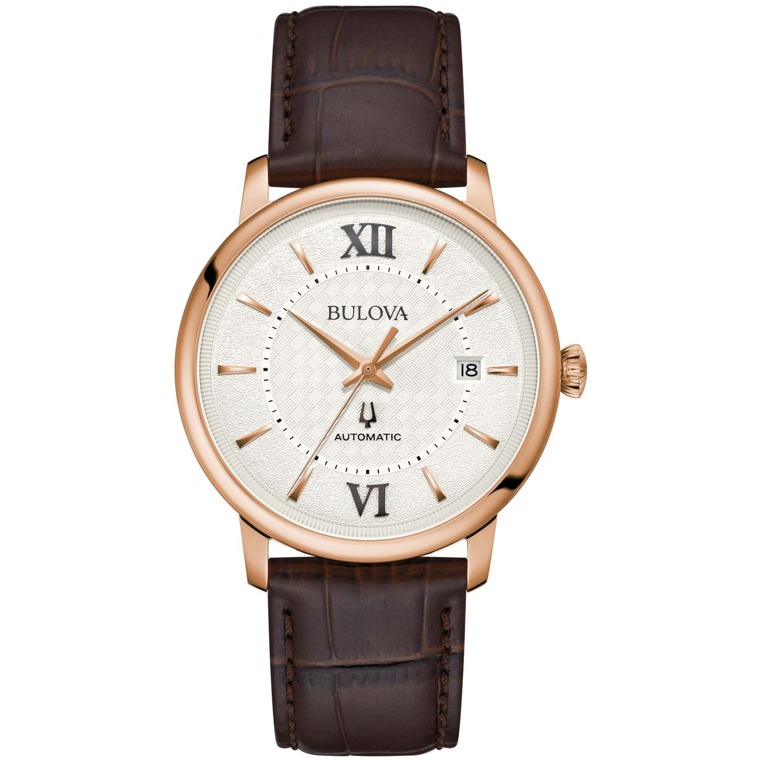 Hudson is a favorite dress watch from Bulova. Automatic movement with 21 jewels and a 42 hour power reserve. Brown croc embossed leather strap with traditional buckle closure. Silver dial with basketweave pattern and textural finishes. Day of the month calendar at the 3 position. Features rose gold-tone hour markers Roman numerals and three hands. Rose gold-tone stainless steel bezel and case. Onion shaped crown. Anti-reflective double domed sapphire crystal window. Lug width: 20mm. Case size: 39mm. Water resistant to 30 M. 3-Year limited warranty.