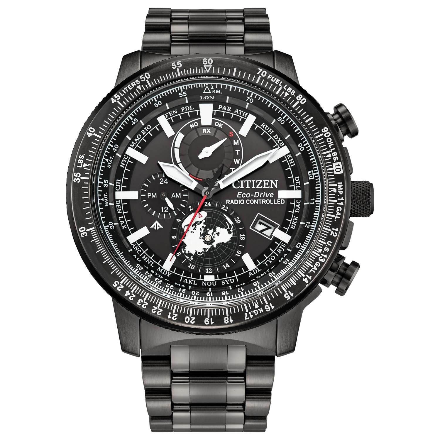 Eco-Drive - runs on light never needs a battery replacement. Global Radio Control timekeeping for exceptional accuracy. World Time by using Northern hemisphere disc. Black dial with three hands and luminous hour markers. Day of the month calendar. Gray plated stainless steel bracelet bezel and case. Chronograph pushers and outer slide rule bezel. Anti-reflective sapphire crystal. Hidden double push button fold over closure. Lug width: 22mm. Case size: 46mm. Water resistant to 200 M. 5-Year manufacturer limited warranty.