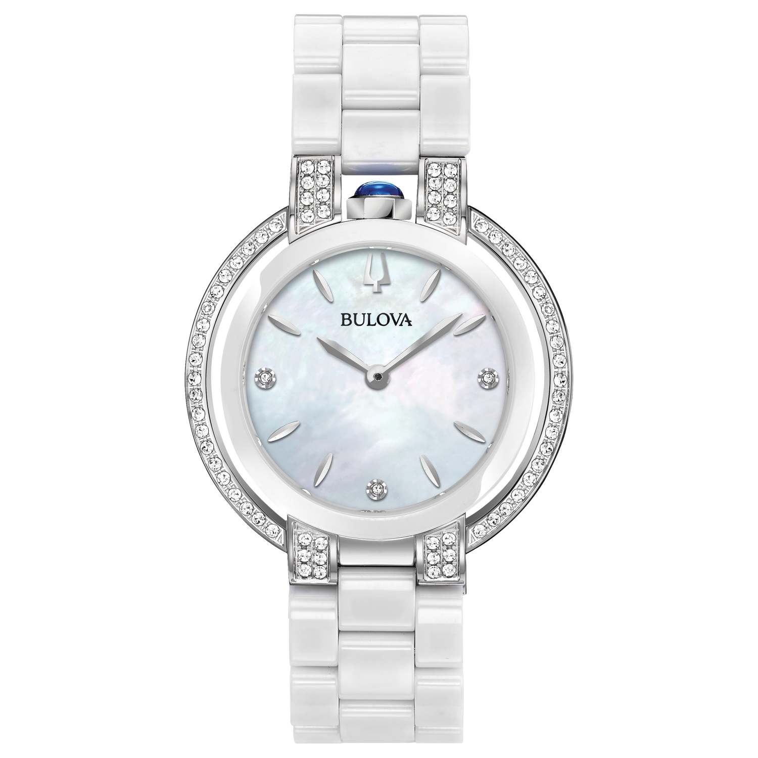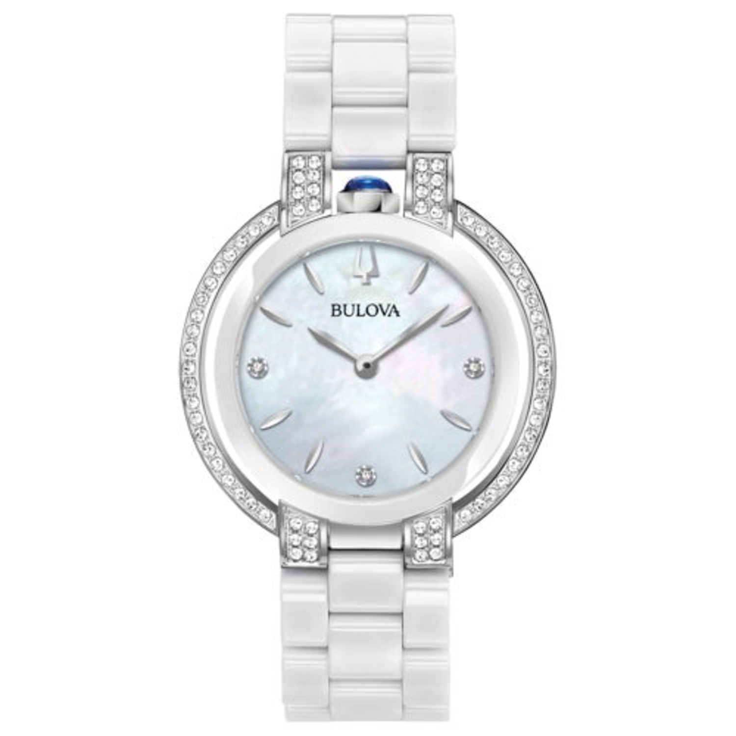 This Rubaiyat Ceramic watch is decked with 73 individually hand set diamonds. Smooth white ceramic bracelet with double push button deployant closure. White Mother-of-Pearl dial with silver-tone and diamond hour markers. Bezel and lugs set with sparkling crystal. Blue spinel cabochon crown at the 12 position. Signature silver-tone Bulova tuning fork logo. Iconic dye struck "Goddess of Time" dimensions case back. Double curved sapphire crystal window. Lug width: 7mm. Case size: 35mm. Water resistant to 30 M. 3-Year manufacturer limited warranty.