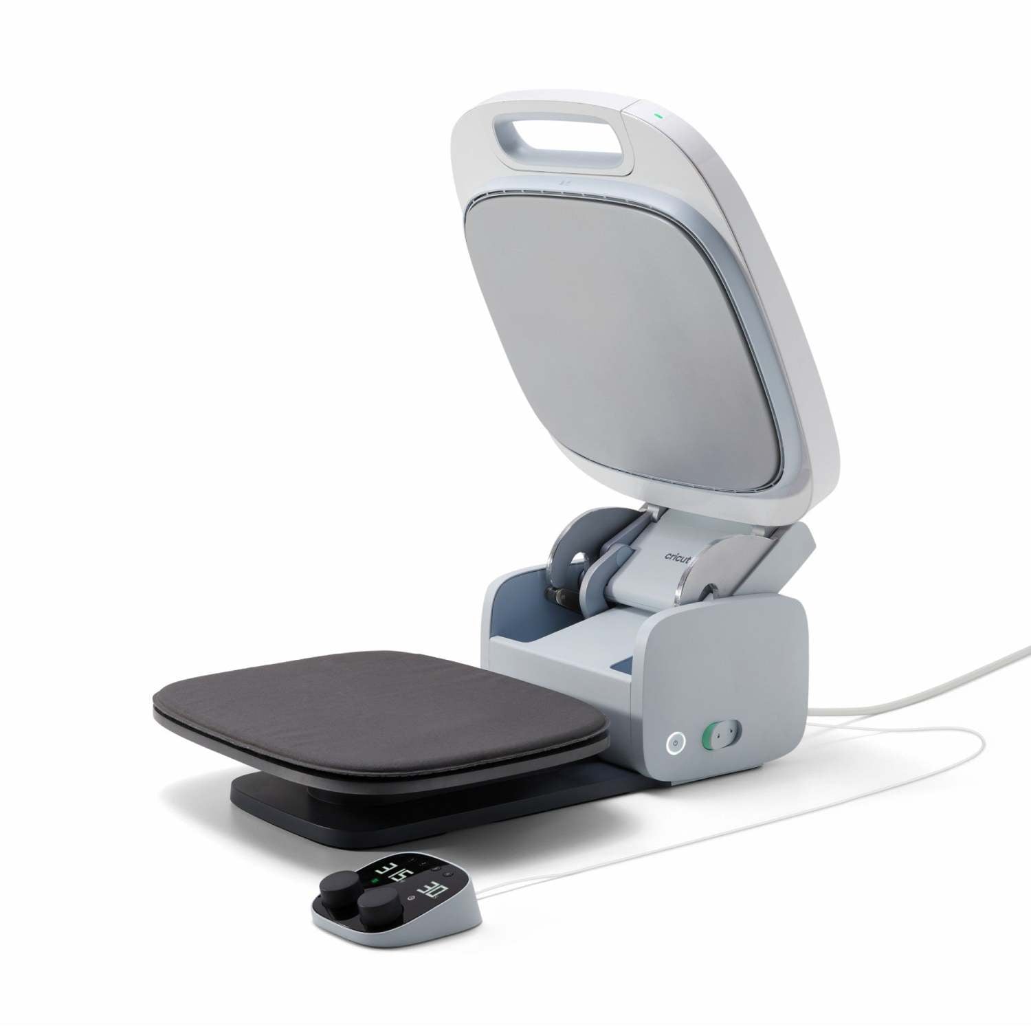 15" x 12" Ceramic-coated heat plate. Zero Effort operation to close with ease & auto-release when cycle is complete. Auto-adjusts to materials up to 2" (5cm) thick with top-down pressing. Control pod with four presets to reduce guesswork. Reaches temperatures up to 400F (205C) for iron-on (HTV) Infusible Ink & sublimation projects. Safety features include auto-off & certified temperature-rated plastics. Sturdy steel construction. Extra-wide clearance in open position. Dual voltage. Includes: Cricut Autopress. Pressing mat. Control pod. User guide.