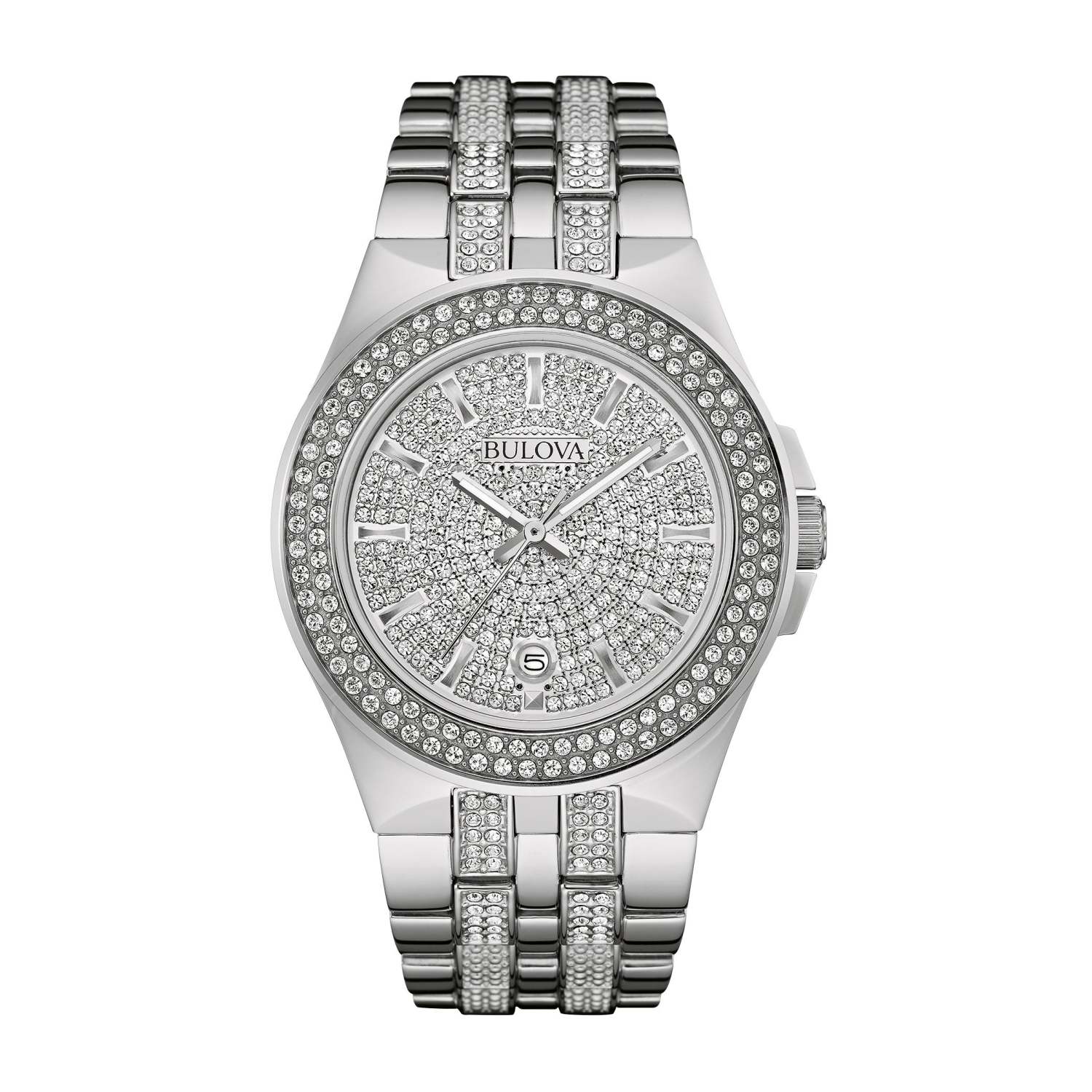Phantom is for the bold and daring from the Crystal Collection. Silver-tone stainless steel bracelet with crystal detail. Silver dial paved with sparkling crystals hour markers and three hands. Day of the month window at the 6 position. Stainless steel bezel fully paved with crystals. Mineral crystal dial window. Deployant closure. Case size: 42mm. Water resistant to 30 M. 3-Year manufacturer limited warranty.