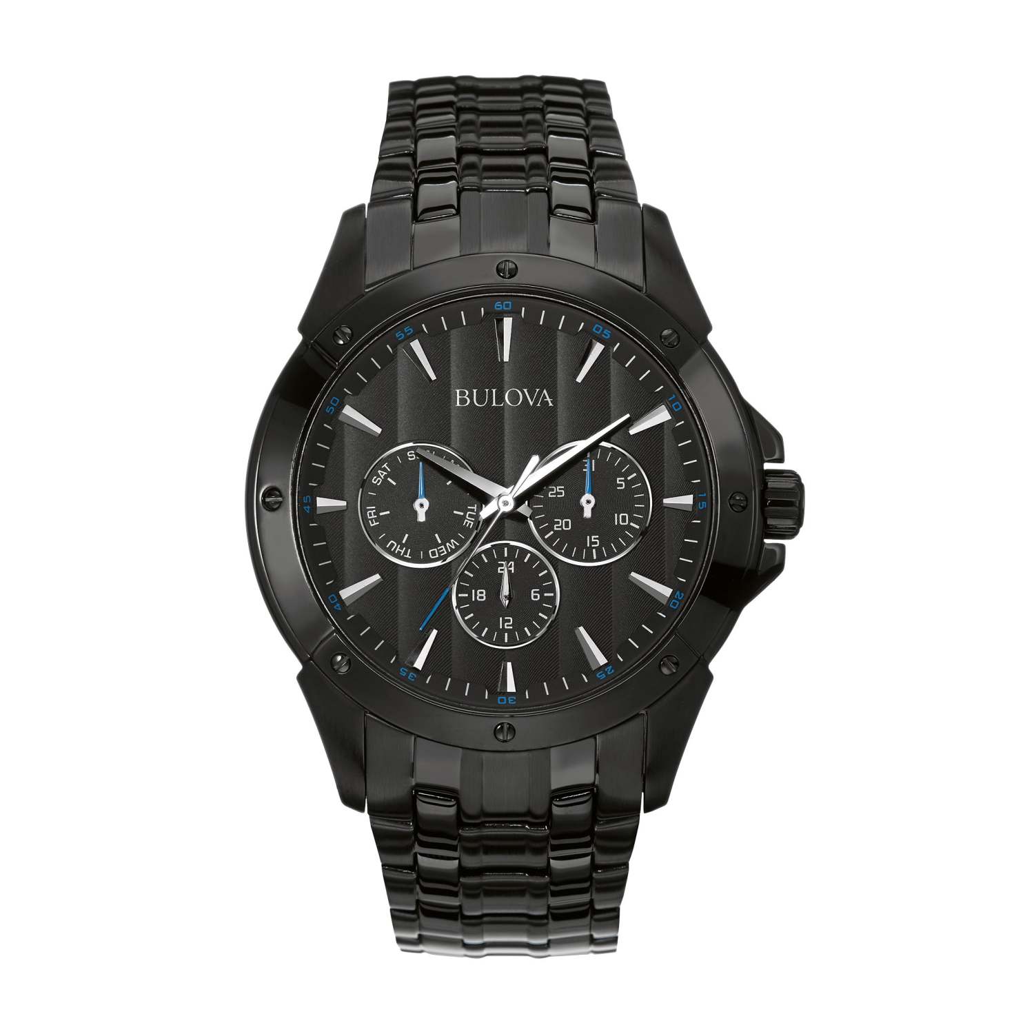 Stainless steel bracelet with a black ion-plated finish. Patterned black dial with silver-tone hour markers and hands. 3-Subdials: Day of the week Day of the month and 24-Hours. Blue accent minute markers along outer rim. Black ion-plated bezel and screwback case. Double push-button fold-over closure. Quartz movement. Mineral crystal dial window. Case diameter: 43mm. Water resistant to 30 M. 3-Year manufacturer limited warranty.