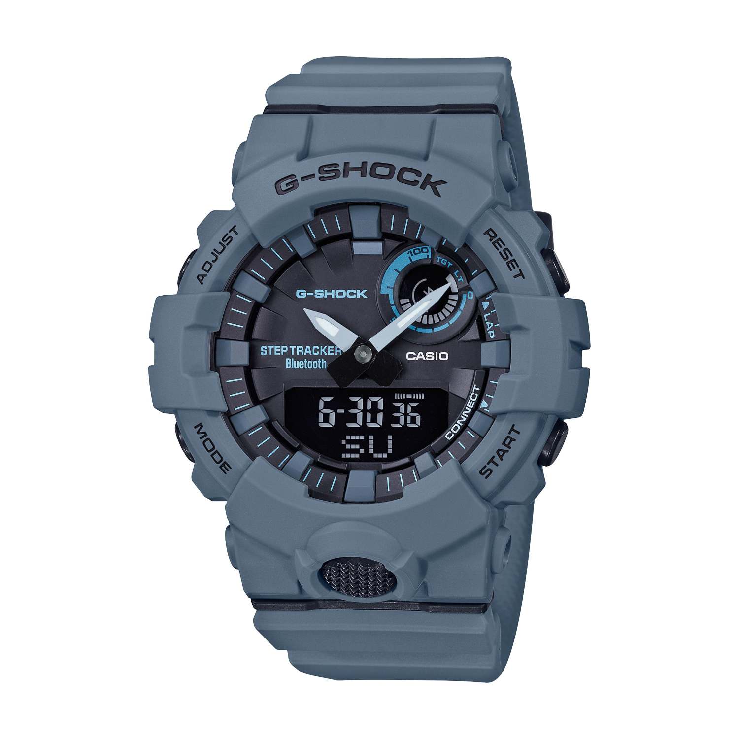 One of the latest additions to the Power Trainer sports lineup from G-Shock. Bluetooth with the G-Shock connected phone app - track workouts calories steps and more. Multi-Timer. Super Illuminator. World time in 31 time zones. New band ring shape to help prevent sliding. More band holes allow a better tightness adjustment. Neobrite. Carbon shock resistant case with resin bezel. Gray blue resin band with traditional buckle closure. Hand shift feature. Water resistant to 200 M. Case size: 51.2mm x 48.7mm x 14.1mm.