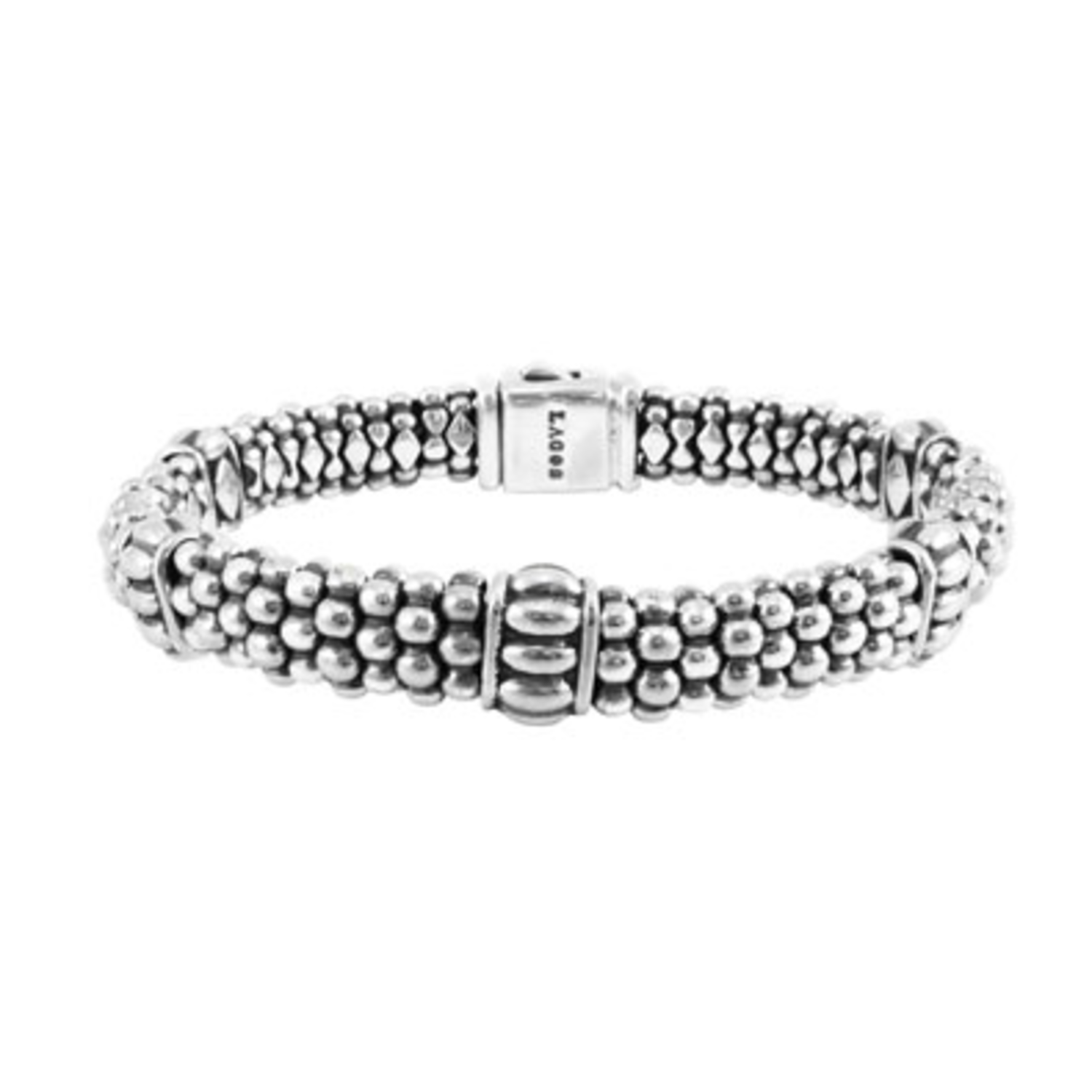 Five fluted stations highlight the rich sterling silver Caviar beading on this versatile oval rope bracelet, finished with a box clasp that displays the LAGOS crest. Dimension: 20x9 mm; Omega clip and post. Fits wrist of 6 1/4" – 6 3/4"