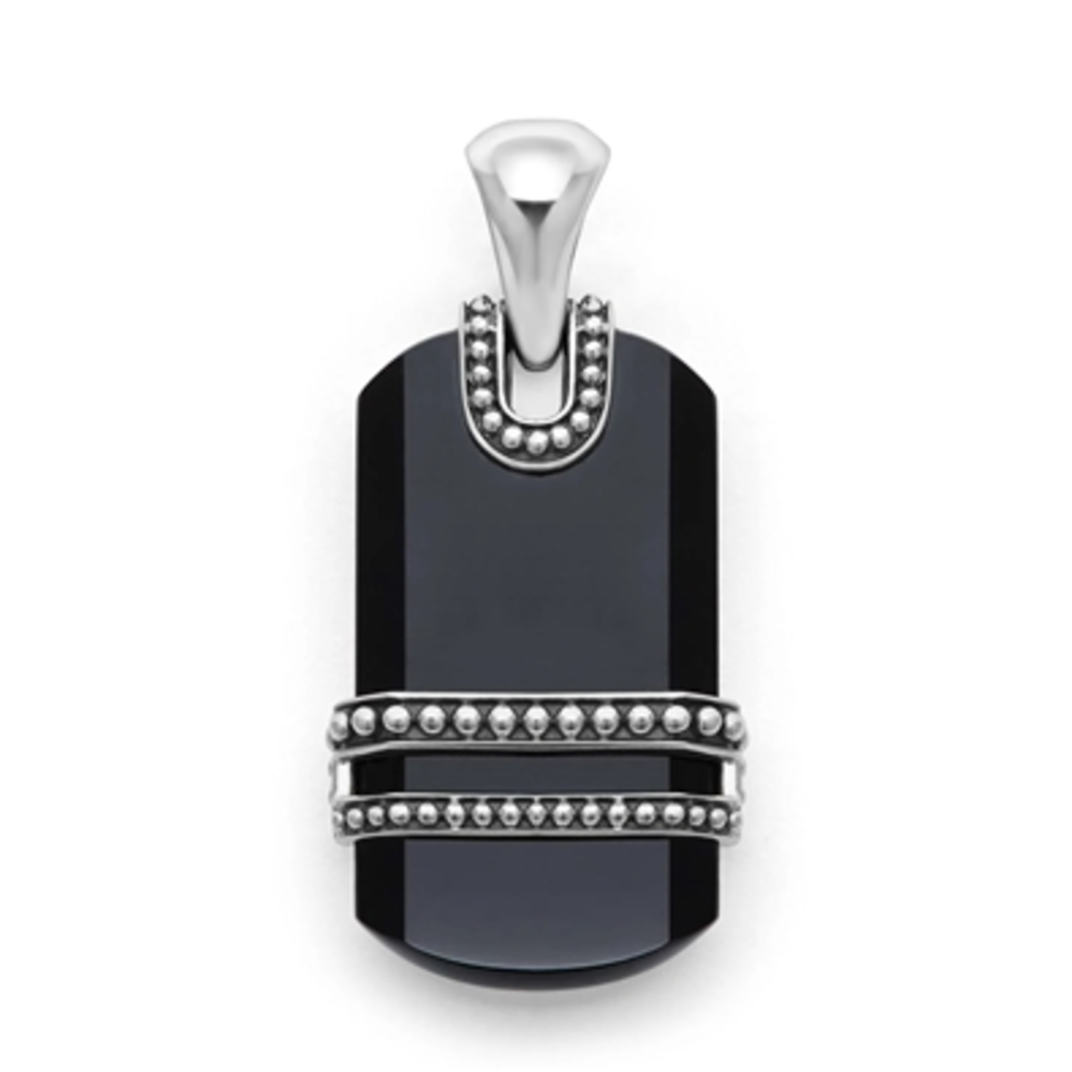This striking tag amulet features a smooth black agate gemstone beautifully accented by LAGOS' signature sterling silver Caviar beading, creating a bold yet versatile piece perfect for everyday wear. Measuring 35mm by 15mm, the amulet includes a universal bale that easily accommodates most LAGOS necklaces, allowing you to effortlessly personalize your look with timeless elegance.