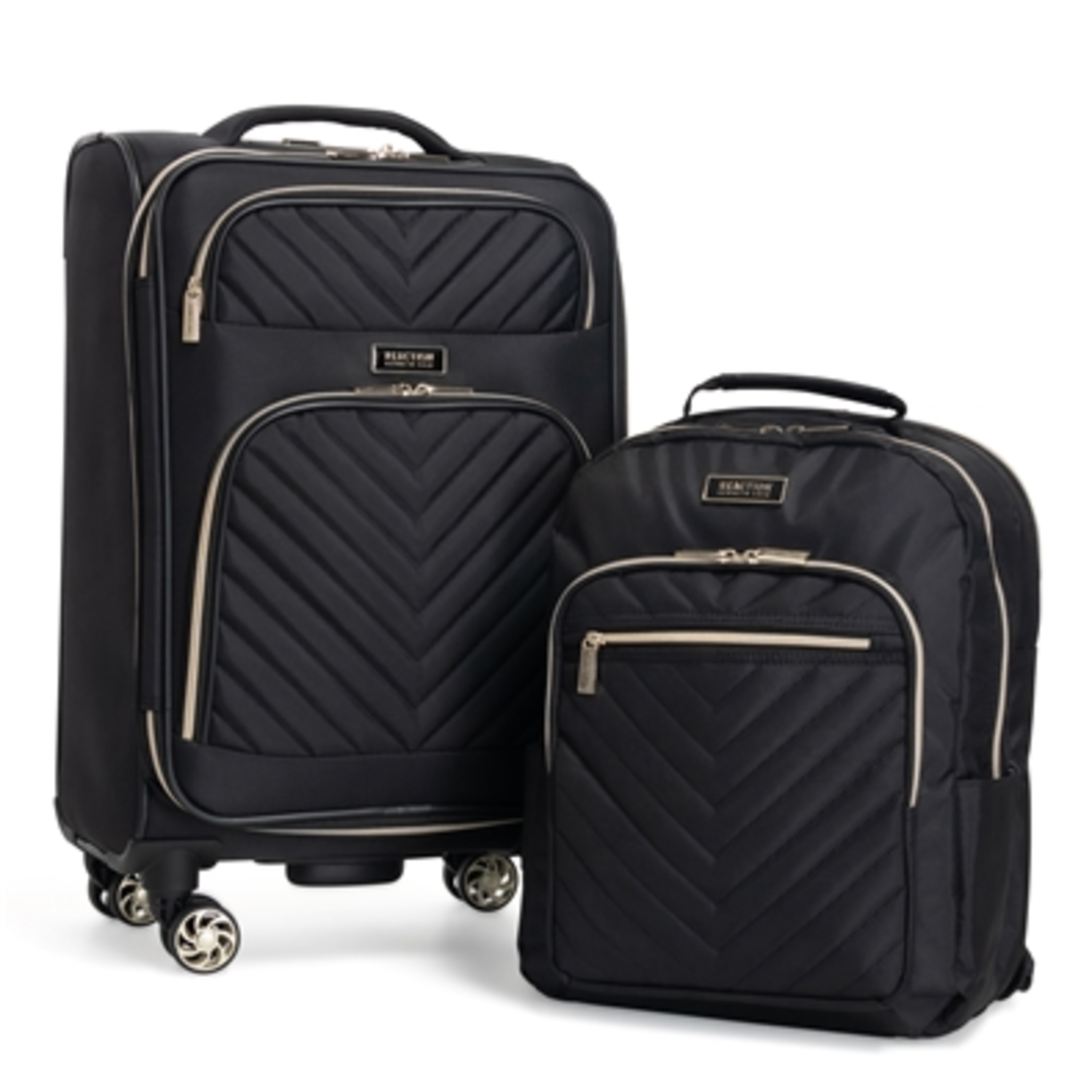 Designed for the trendy, modern business woman who values both style and function, this 2-piece set from the Kenneth Cole Reaction “Chelsea” collection features an underseater and a travel laptop backpack. This luggage features 4-wheel spinners that rotate 360 degrees paired with a telescoping trolley handle for easy maneuvering. The fully lined interior has multiple zipper pockets for all your belongings, and the main compartment has garment restraining straps, ensuring your belongings stay in their place during your trip. Two more pockets located on the exterior of the bag add easy-access storage. The underseater is covered in a durable poly twill with quilted chevron detailing, finished with gold self-repairing zippers. Backpack features a separate rear padded computer compartment that fits most laptops up to 15-Inch screen. Roomy, main compartment includes a smaller padded laptop/tablet pocket and 2 open top accessory pockets. Front exterior of backpack features a zipper pocket for easy access to frequently needed items and zip around pocket with an extensive business organizer. Rear exterior features padded shoulder straps for maximum comfort while on the move. Both the suitcase and backpack feature premium self-repairing gold coil zippers meant for long lasting use. The backpack exterior features dual side exterior open top beverage/holster pockets. Rear of backpack also features a trolley strap that fits over most luggage upright handles for hands-free carrying. 20” carry-on suitcase designed to meet U.S. based airline carry-on size requirements and fits into most airline overhead bin compartments. The perfect women's travel backpack and carry-on suitcase for mindful fashion forward commuters. Underseater Dimensions: 17” H x 13” L x 9” D. Underseater Weight: 5 lbs. Backpack Overall Size: 16” H x 11” W x 7.5” D. Backpack Computer Dimensions: 15.25” H x 10” W x 1.75” D. Backpack Weight: 2.15 lbs. Backed by a manufacturer's lifetime limited guarantee.