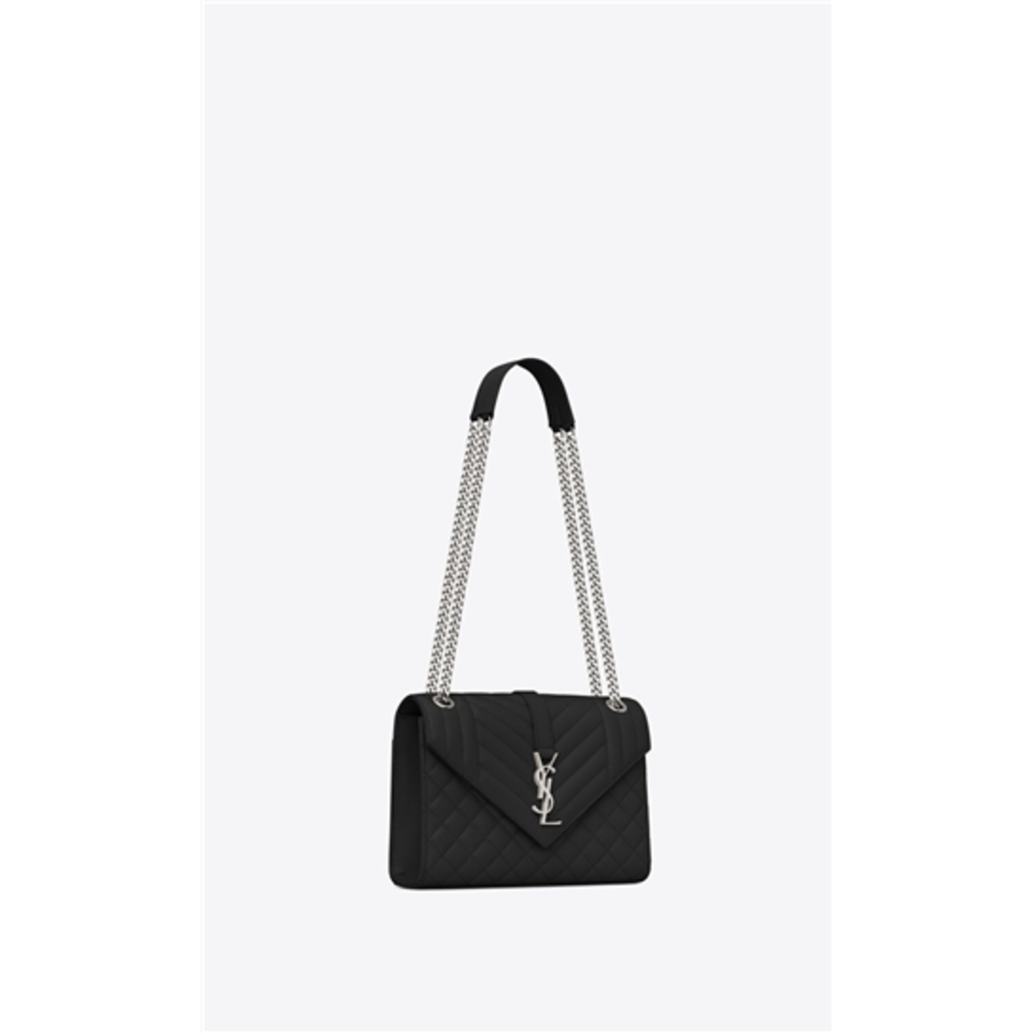 The Envelope Chain bag is the Little Black Bag with extra personality. Matelassé stitching on durable calfskin leather gives the piece extra texture with a mix of vertical, chevron, and diamond quilted overstitching. This bag comes in black to match everything in your wardrobe and help you make a statement: you are more than meets the eye. You are classic. You are chic. You are anything you need to be. Whether you're going for sophisticated cool, or adding a little edge to your look, this bag's YSL initials displayed in silver toned hardware and accompanying chain and leather strap are a must have. The strap can be worn as a long shoulder or a cross body for maximum versatility to make every day a luxurious one. Features:100% calfskin leather. Magnetic snap closure. Magnetic snap closure. Handle drop: 10.43" Strap drop: 21.65". Interior: 1 main compartment and 1 flat pocket. Exterior: 1 flat pocket at the back. Grosgrain lining. Dimensions: 9.4"x6.8"x2.3"