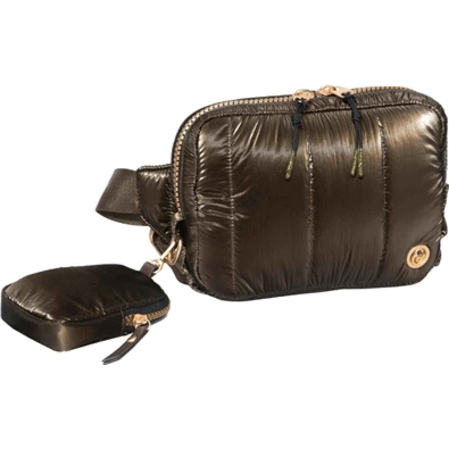 9-Inch Metallic Puffer Tubular Quilted Nylon Passport Travel Sling with Adjustable Strap, Detachable Circular Zippered Pouch, Interior Zip Pocket, and Cell Phone Slip Pocket.