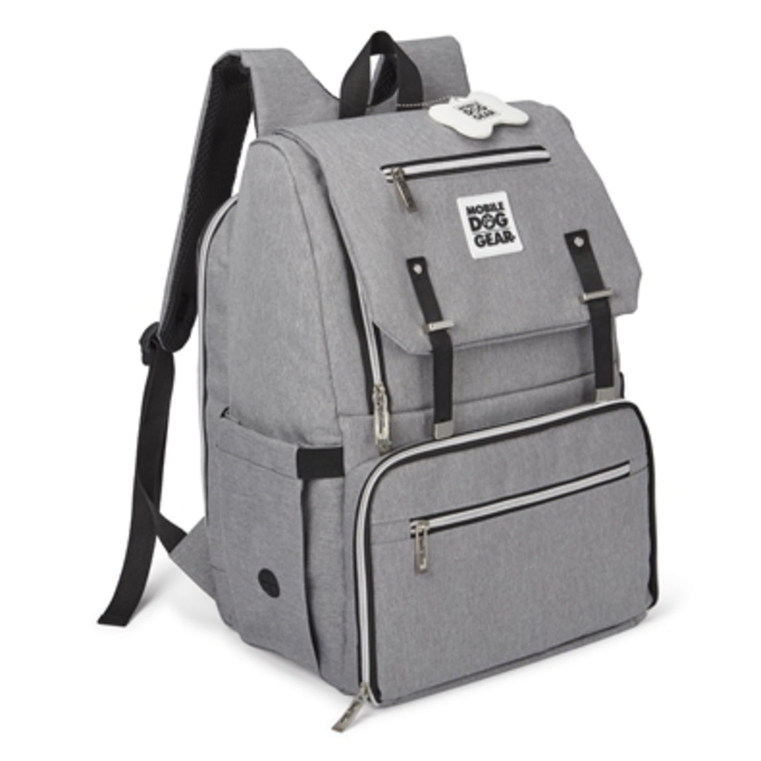 Mobile Dog Gear's Ultimate Week Away Backpack will allow you to conveniently pack and organize your dog's belongings for long or short trips. Our travel dog bag comes with two 5-cup lined food carriers for food and treats and two 2-cup collapsible silicone dog bowls that zip up with the placemat on the front of the bag. Features include side pockets, zippered inside mesh pocket, mesh pocket in front compartment, adjustable padded straps, built in waste bag dispenser, and large zippered drop-down storage compartment located in the back of the bag. The convenient waste bag dispenser is located at the bottom side of the bag, so you can simply reach around while walking and grab the waste bags and you are good to go. Our travel bag for dogs also meets airline carry-on requirements and features a bone shaped luggage ID tag and a luggage strap that fits over pull-up suitcase handles. The drawstring backpack is perfect for carrying essentials such as water bottles, dog toys, doggy waste bags, leash and can even fit a dog blanket! Our dog travel backpack has a polyester exterior that is resistant to tearing and ripping. The interior is fully lined and easy to keep clean. The backpack and food carriers are hand washable, and the silicone bowls are top rack dishwasher safe.