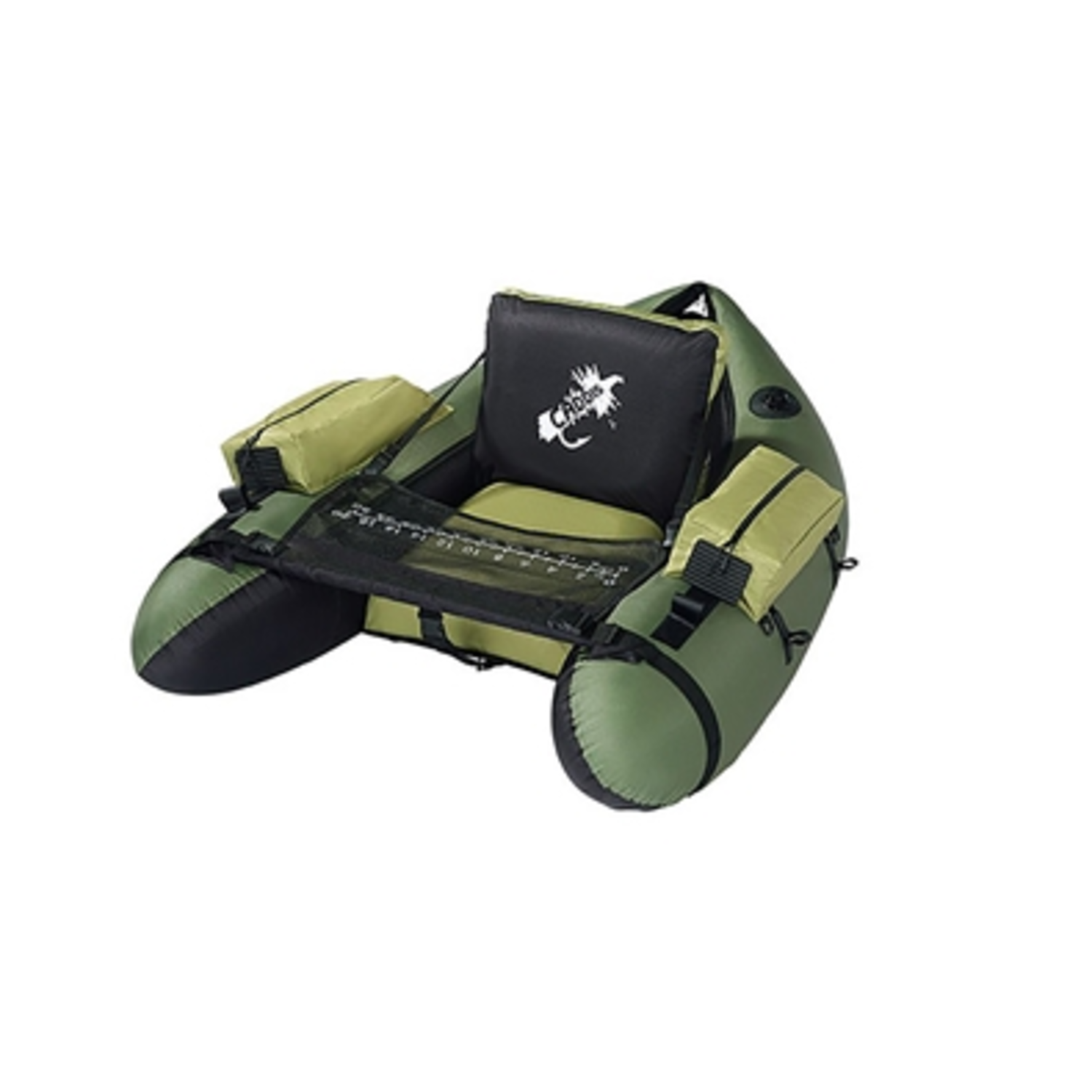 The perfect addition to any outdoor adventure. Tear-drop design is easy to get in and out of. Cross-stitched construction with double-stitched critical seams. PVC bottom, seat, and front tips protect against punctures. Inflatable seat lets you sit high for visibility. Back rest fights fatigue. Stabilizer bar with a lap apron with 2 large gear pockets and 2 auxiliary pockets for convenience. Integrated cargo storage behind the seat with removable fly patches and rod-holder straps. Boston valves for easy inflation/deflation while fluorescent detailing keeps you visible in the water.