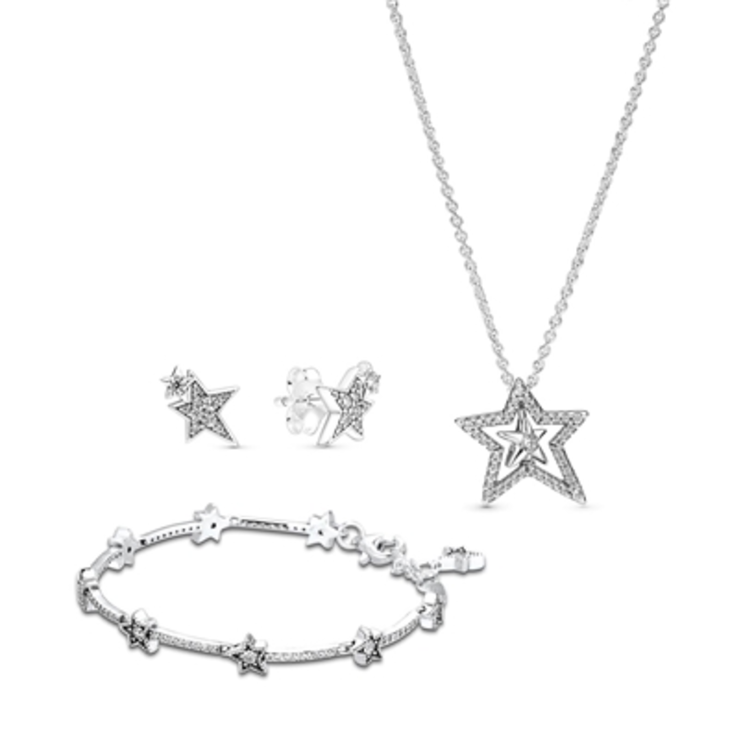 The beauty of a crisp, star-filled winter's night is brilliantly captured in one stand-out jewelry set. The sterling silver Sparkling Asymmetric Stars Stud Earrings feature pavé cubic zirconia and microbeads with one large asymmetric star accented by an adorable smaller star. And with its spinning star cutout in the center of an eye-catching sterling silver and cubic zirconia-covered larger star, the Pavé Asymmetric Star Collier Necklace, along with the Celestial Stars Bracelet, serves as the perfect addition to this celestial-themed set.