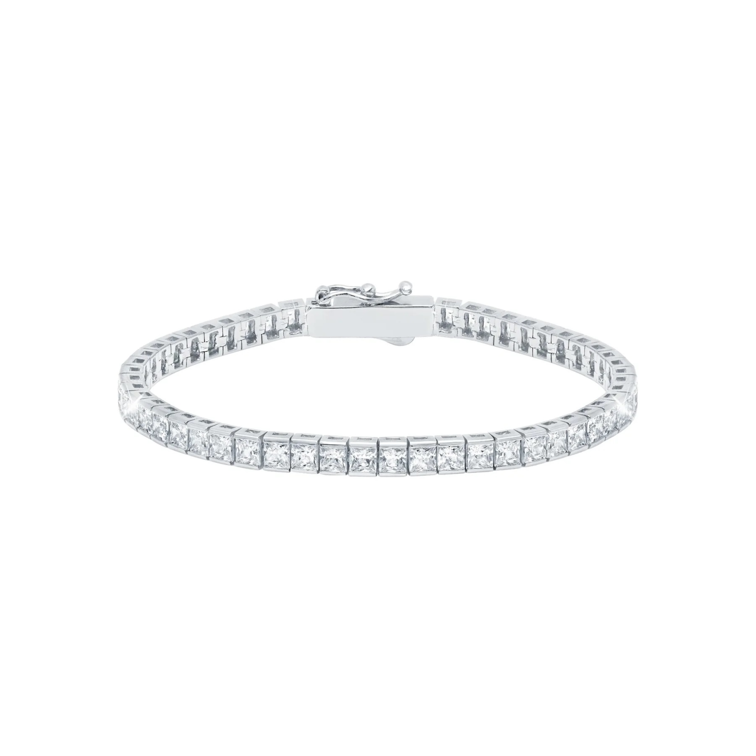 Classic Medium Princess Tennis Bracelet Finished in Pure Platinum, Dimensions: 4.06 mm Wide, Finished In Pure Platinum, 0.925 Precious Sterling Silver, 9.75 Carat Total Weight, Carat total weight based on Diamond equivalent and Handset with Flawless Cubic Zirconia.