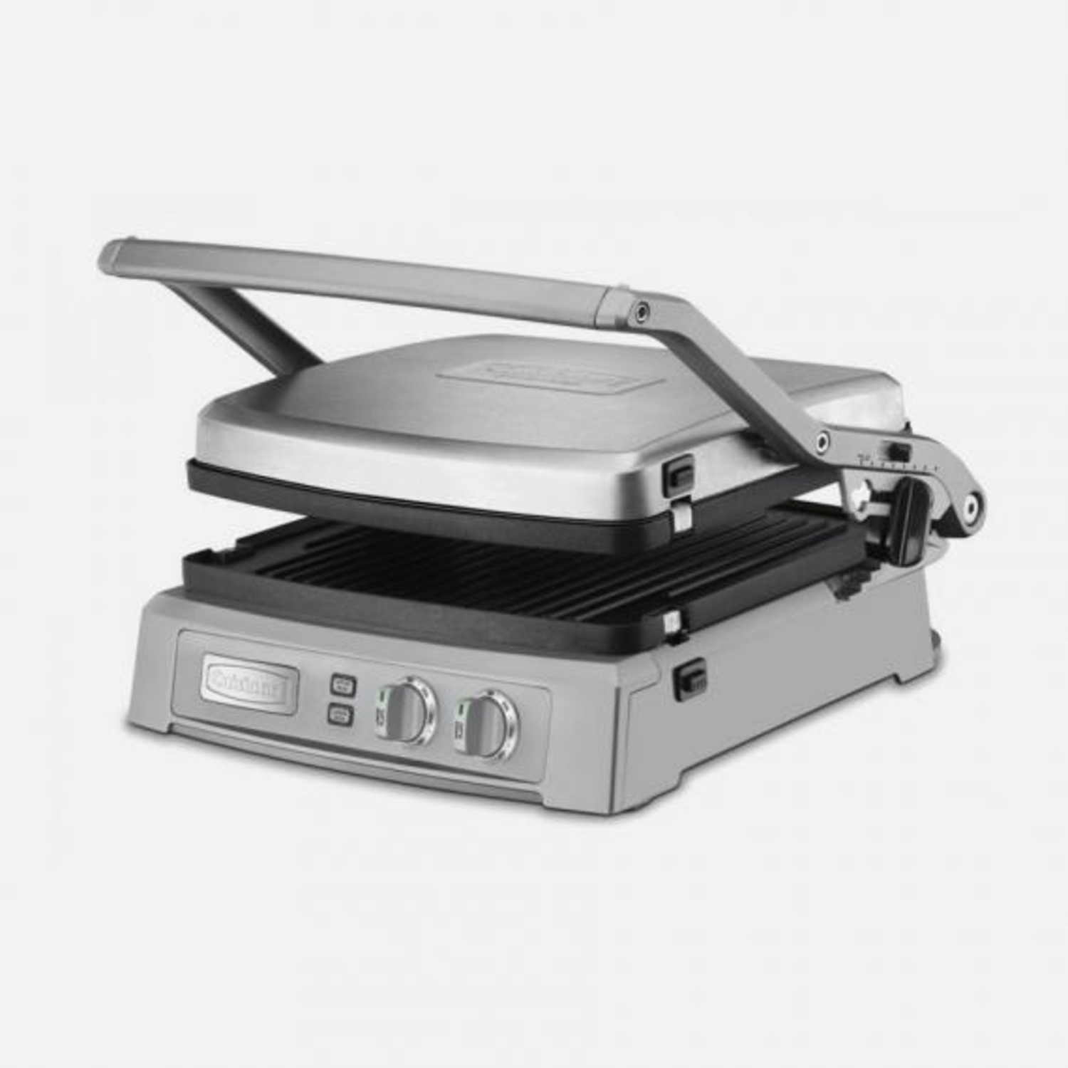 With six sizzling cooking options, the Griddler Deluxe raises your grilling game in stylish brushed stainless steel. The dual-zone temperature control gives home chefs complete control over the reversible grill and griddle plates for ultimate breakfasts, panini lunches, and burgers or fajitas for dinner. The 240 square inch grilling surface is ideal for entertaining friends or fun family meals and our SearBlast feature locks in the flavor of juicy steaks at 500?F. With dishwasher safe accessories and 1800 watts of power, deluxe grilling is as enjoyable as it is easy with Cuisinart!